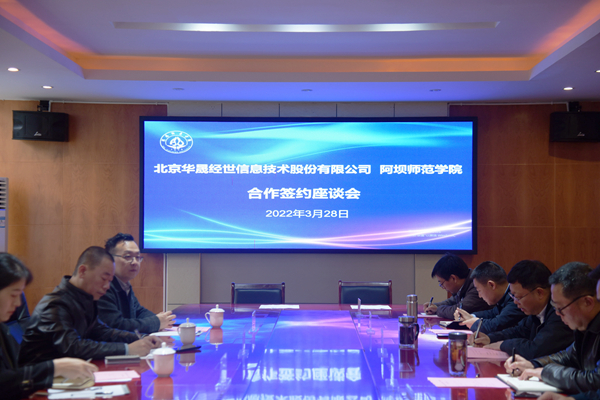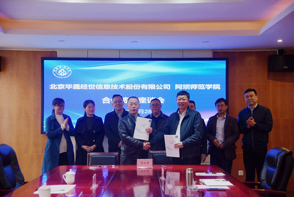 向武致欢迎辞。他代表阿坝师范学院对北京华晟经世信息技术股份有限公司签约负责人的到来表示热烈欢迎,并简要介绍了我校的发展历史及基本情况。他讲到,学校围绕两评估两转型开展工作,着力构建完整学科体系,实现目标一体化以及资源的合理共享,从而贯彻落实中国西部民族地区的乡村振兴战略任务。陶松对公司的业务发展方向进行简要介绍。他表示,希望双方发挥优势,深入合作,并预祝我校在评估工作中取得圆满成功。