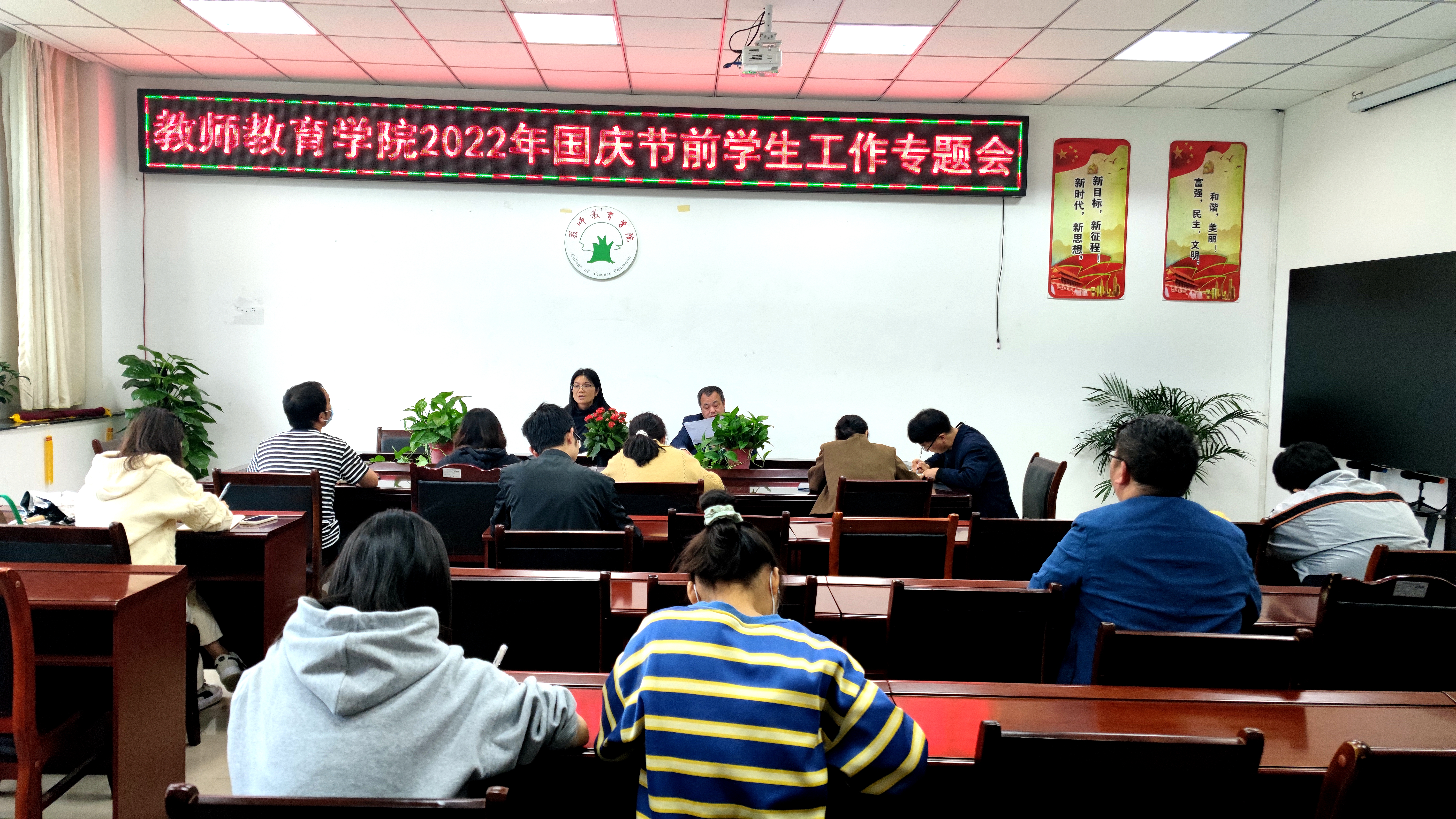 【教院讯】为落实我校节假日疫情防控相关要求,9月29日16:00,教师教育学院在B305会议室召开2022年国庆节前学生工作专题会。学院党委书记邓志光、副书记范燕华、各行政班级班主任参加会议。
