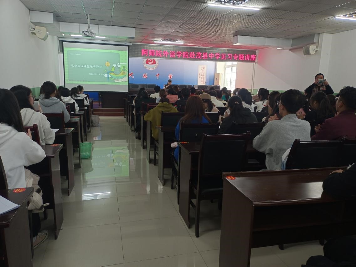 11月9日14:00,同学们准时来到会议室聆听实践周的第一堂讲座。该讲座由茂县中学英语组教师李明翠老师主讲,以“高中英语课堂教学设计”为主题,她围绕课堂教学设计前的准备以及教学思路的设计作了深入的讲解。在李老师幽默风趣的讲解过程中,同学们对高中英语教学有了更加深入的认识和理解。
