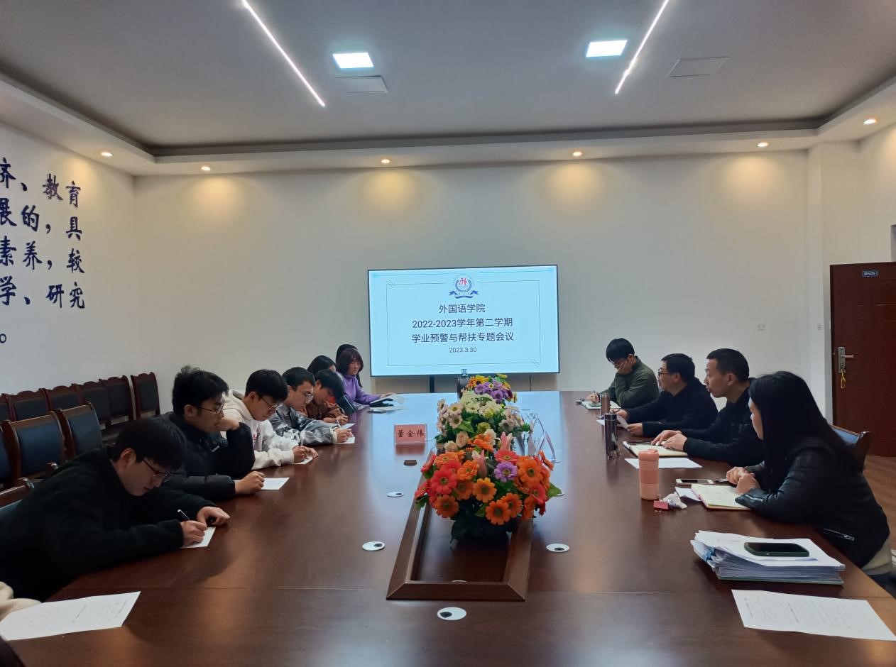 【本网讯】 为进一步加强学风建设,切实做好学业困难学生帮扶教育,外国语学院于2023年3月30日18:20在学院会议室B505召开学业预警与帮扶专题会议。参加本次会议的有外国语学院党委书记张茂军、院长刘远志、学工办主任兼分团委书记晏乔、教科办主任卜庆立、党政办副主任唐明安、辅导员李柳和邹明松以及学业预警的全体学生。