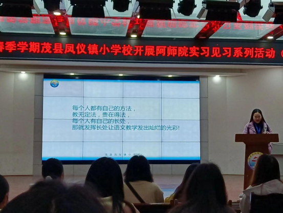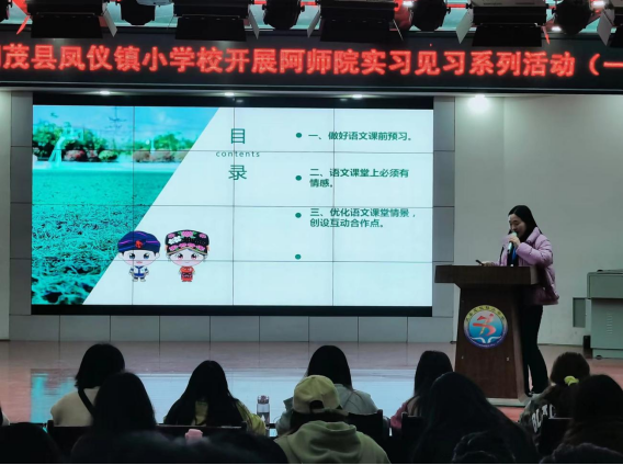 【本网讯】“捧着一颗心来,不带半根草去。”为让师范生学习先进的教育理念,学会与学生真诚互动,阿坝师范学院文学与传媒学院2022级汉语言文学2班同学赴茂县凤仪镇小学校开展了为期一周的教学实践活动。2023年3月31日上午,同学们聆听了凤仪镇小学校马俊丽老师的讲座。