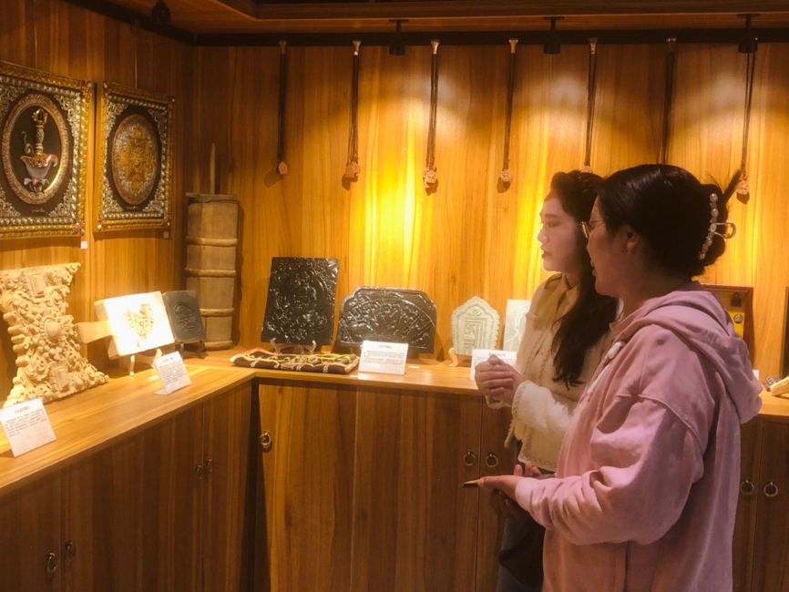 在美术学院院长黄洋教授陪同下,琼措书记首先考察了阿坝州非遗美术研究中心(教育基地),黄洋院长介绍了中心建设的主要目的在于发挥科学研究、社会服务等高校功能,通过构建校地企三方协同机制,助推阿坝州非遗保护与传承工作再上新台阶,并从实物收集、展陈布置、研究方向等方面介绍了目前的工作情况。