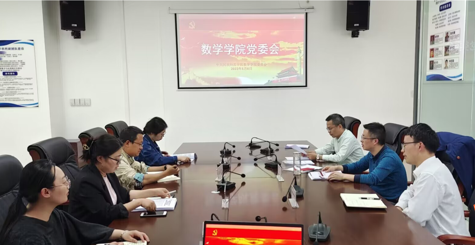 【本网讯】2023年5月6日下午14:30,数学学院在实验楼C412会议室召开学院党委会。本次会议主要内容为传达重要文件精神、布置工作任务以及开展党委理论中心组学习。数学学院党委书记蒋自国、党委副书记、院长杨仕椿,党委纪检委员、副院长赵伟,党委统战委员蒲可莉、党委青年委员蒲永燕、党委宣传委员谷琳琳、组织员金玉洁参加了本次会议。本次会议由学院党委书记蒋自国同志主持。