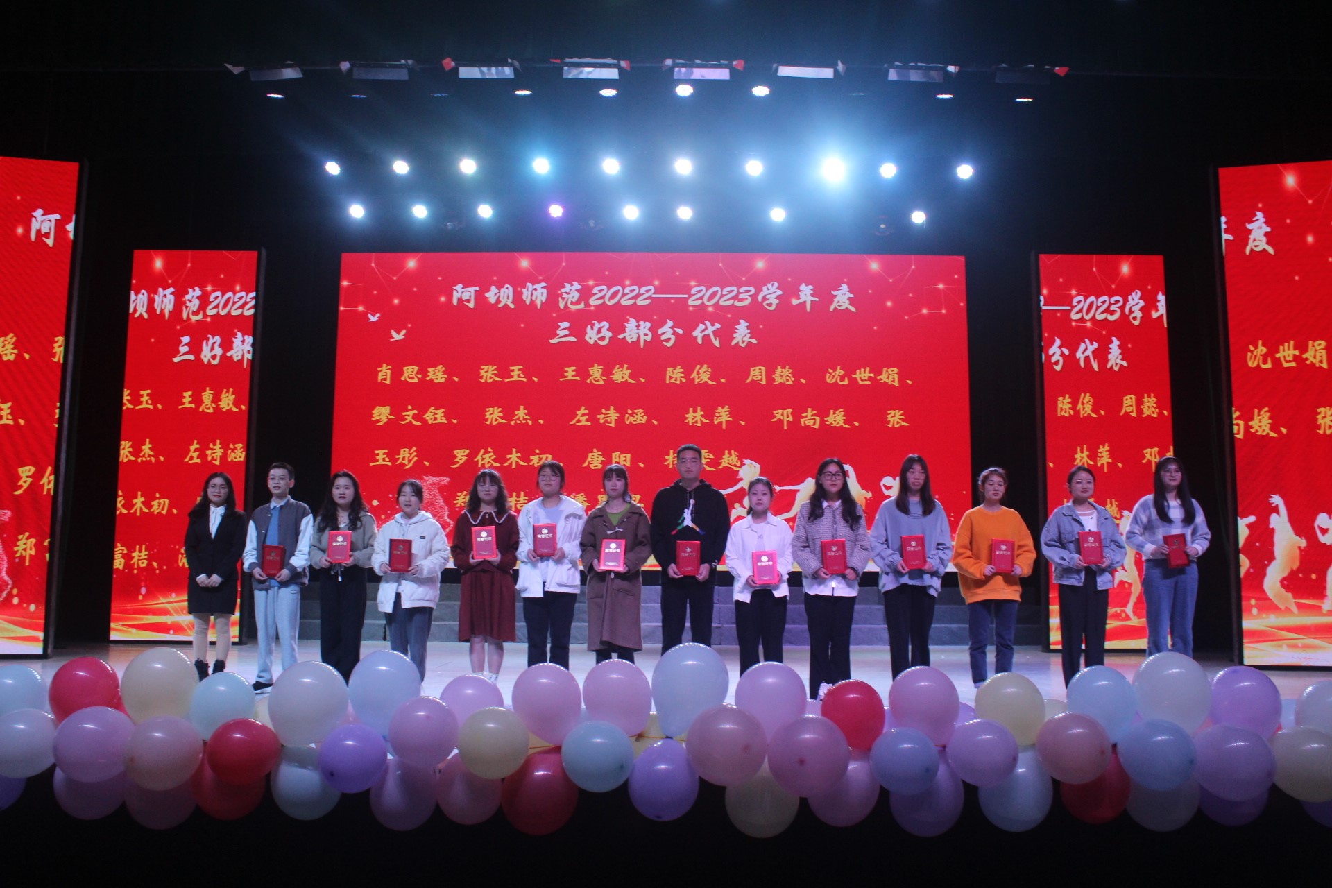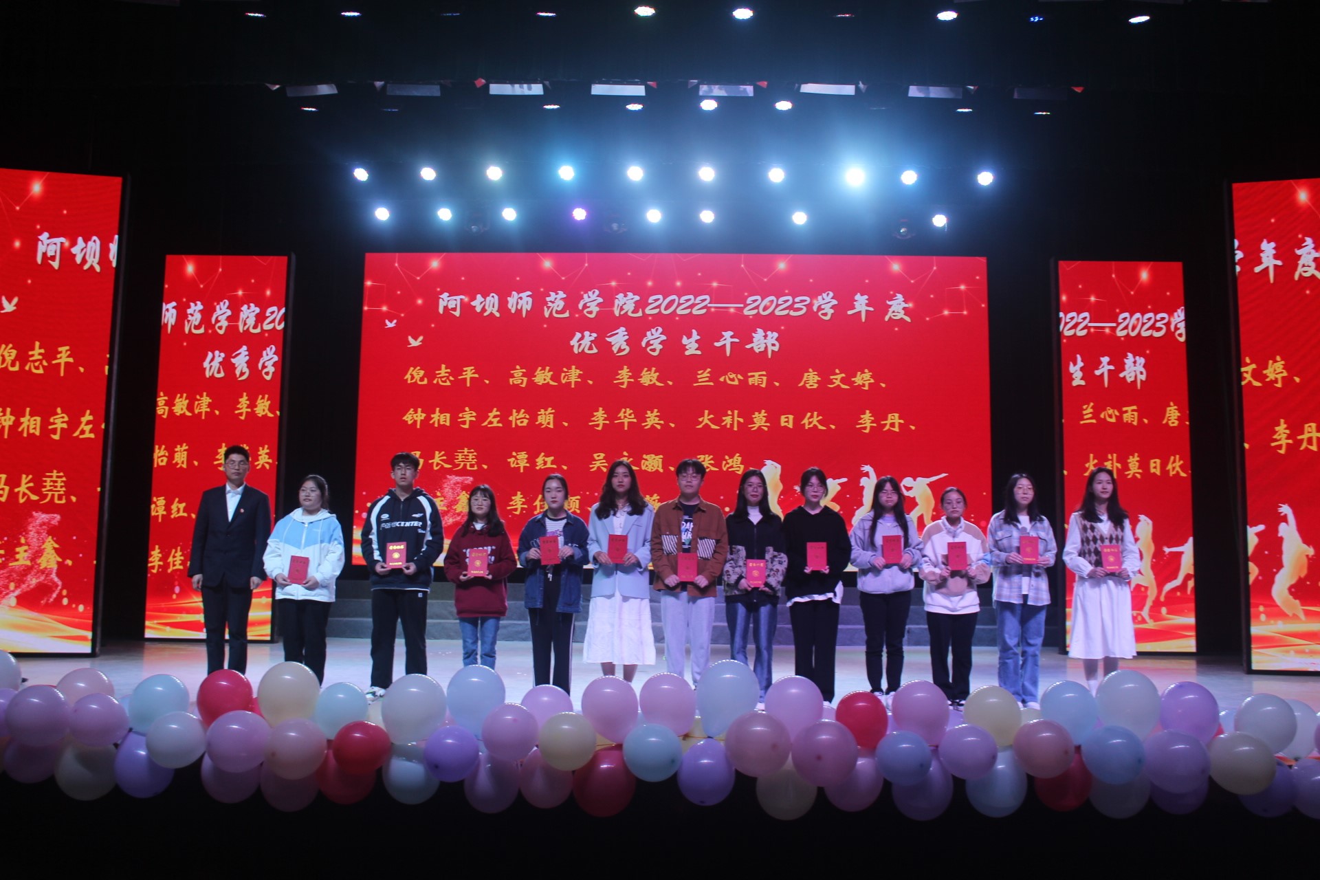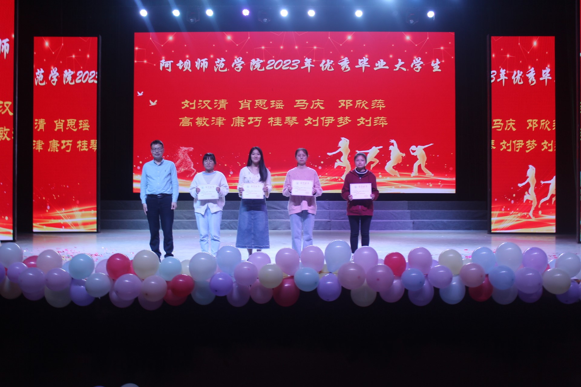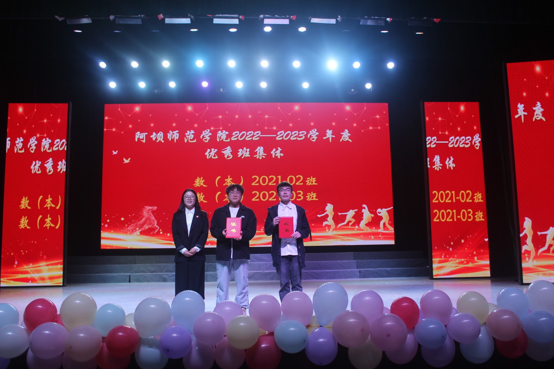 本次毕业晚会,朗诵、歌舞、小品、合唱等精彩的节目给大家带来了丰富的视听盛宴。时间就像飞鸟,滴答滴答向前走。人生的相遇,始于初秋:短暂的离别,终于剩下。我院教师代表带来的朗诵《一起走过》,表达了我院全体教师对毕业生的祝福、期盼与叮嘱。由数学学院22级数应2班的光影剧《我的大学》复刻了大学四年从军训到实习的点点滴滴一个个难忘记忆的画面在大屏幕上重现。在歌曲《天后》后,进入颁奖环节,由我院辅导员樊丽梅老师、王全智以及党政办主任谷琳琳分别对2022-2023学年度三好学生、优秀学生干部、优秀班集体进行颁奖并合影留恋。