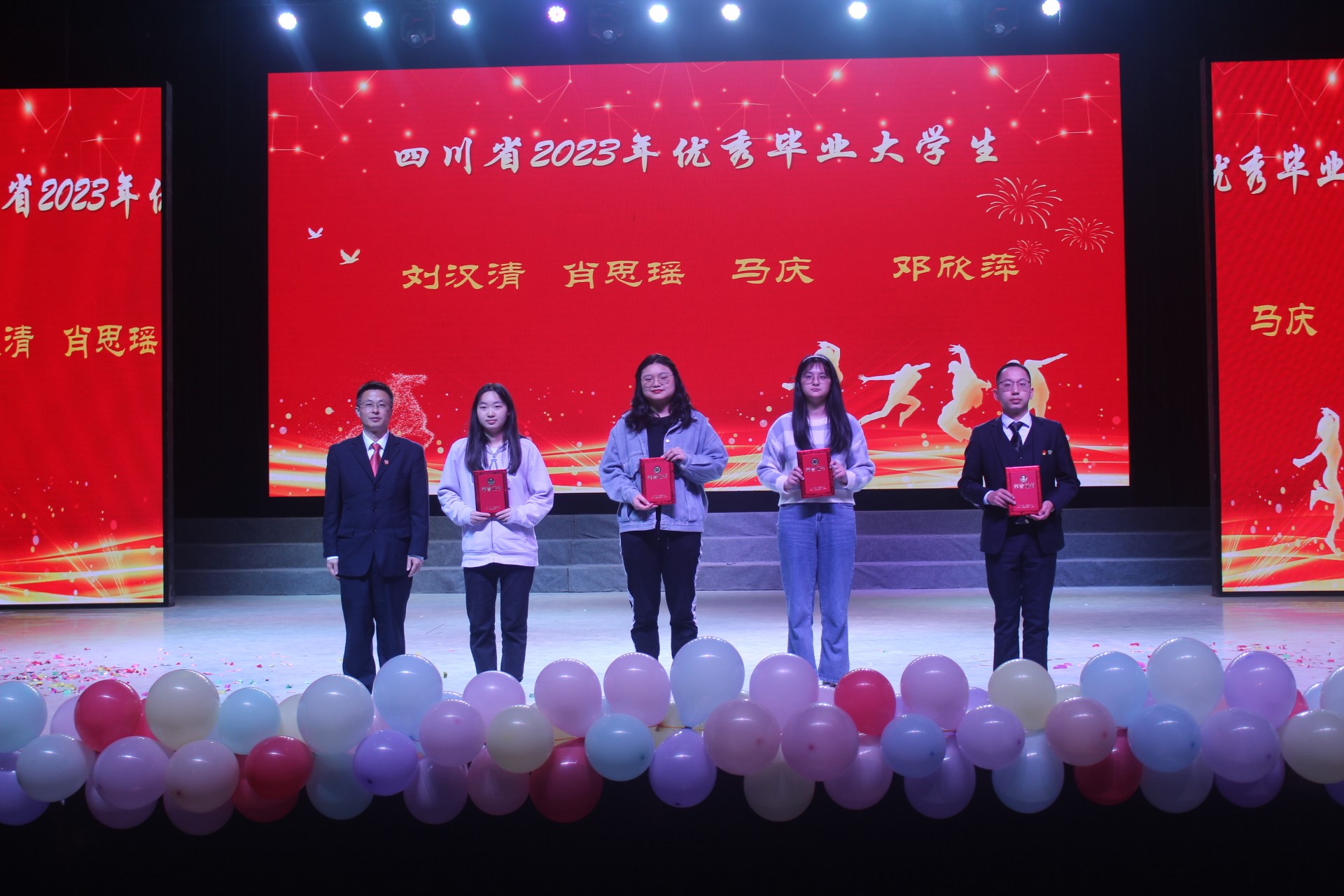 在激动人心的《数字滚动抽奖》过后,合唱《星辰大海》、舞蹈《Yes Ok+阳光男孩》、配音《小美的论文》,歌曲《遇见+后来》一步步让晚会升温,多次将晚会气氛推向高潮。颁奖环节,由我院长杨仕椿教授、党委书记蒋自国教授为2023年校级优秀大学毕业生、省级优秀大学毕业生颁发证书并合影留恋。