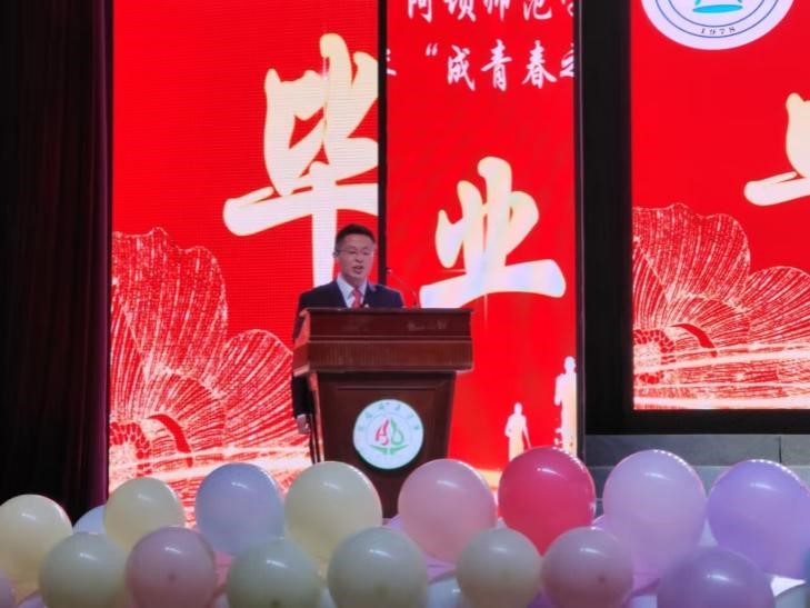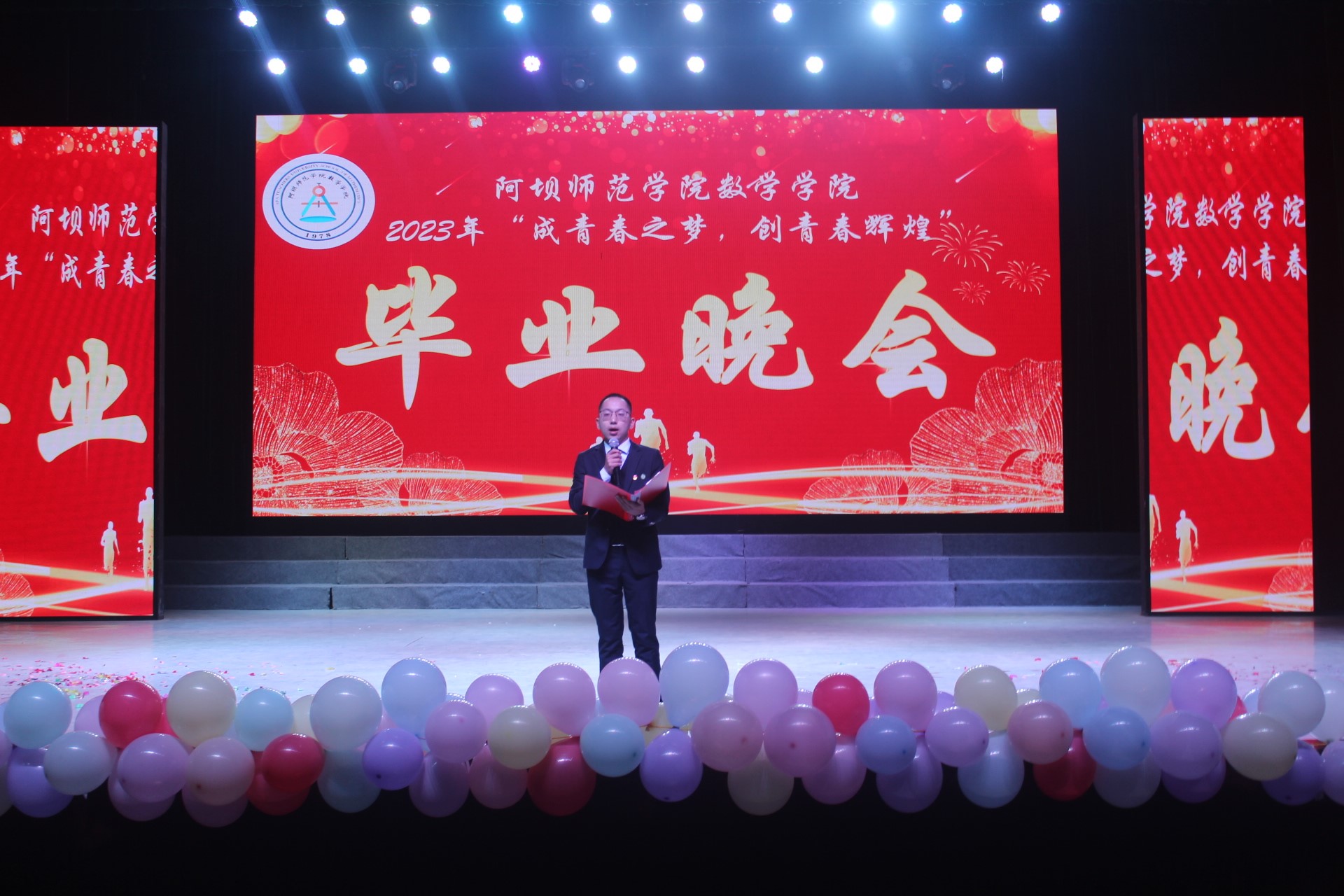 晚会在我院给毕业生的祝福视频中缓缓拉开帷幕。视频结束,由我院学子带来《不再犹豫》、《我的天空》两首歌曲进行热场,欢快的节奏充斥整个现场。随后,在热烈的掌声中,我院党委书记蒋自国教授致辞,他代表学院向数学学院全体毕业生致以热烈的祝贺。他寄语毕业生:“阿师数学人”应立大志向,永远与时代主题同心同向;“阿师数学人”应有大毅力,永远保有坚韧不拔之志;“阿师数学人”应有大气量,永远保持优秀的品质。最后,蒋书记祝愿毕业生们前程似锦、鹏程万里。