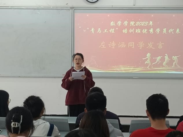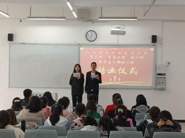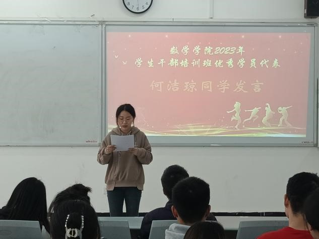 【本网讯】2023年5月9日12:30,我院于树人楼C101举行2023年“青马工程”培训班暨学生干部培训班结业仪式。出席本次活动的领导及老师有,数学学院党委书记蒋自国教授、数学学院团委书记金玉洁老师、数学学院辅导员樊丽梅和王全智老师。会议由郭亮和李佳颖主持。