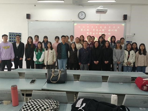 会议伊始,主持人先介绍出席本次活动的领导及老师。随后,全体人员起立,奏唱团歌。团歌结束,由蒋自国教授发言,他在讲话中指出,实施“青马工程”培训和学生干部培训是践行为党育人、为国育才初心使命,落实立德树人根本任务的重要战略任务,必须常抓不懈,希望各位同学在本次培训后,都能有所收获、有所成长。接着,由蒋自国教授为获奖同学颁奖,并合影留念。随后,分别来自“青马工程”培训班和学生干部培训班两位优秀学员代表进行发言,与大家共同回顾了本次集中学习的经历。至此结业仪式圆满结束,全体同学一起合影留念。