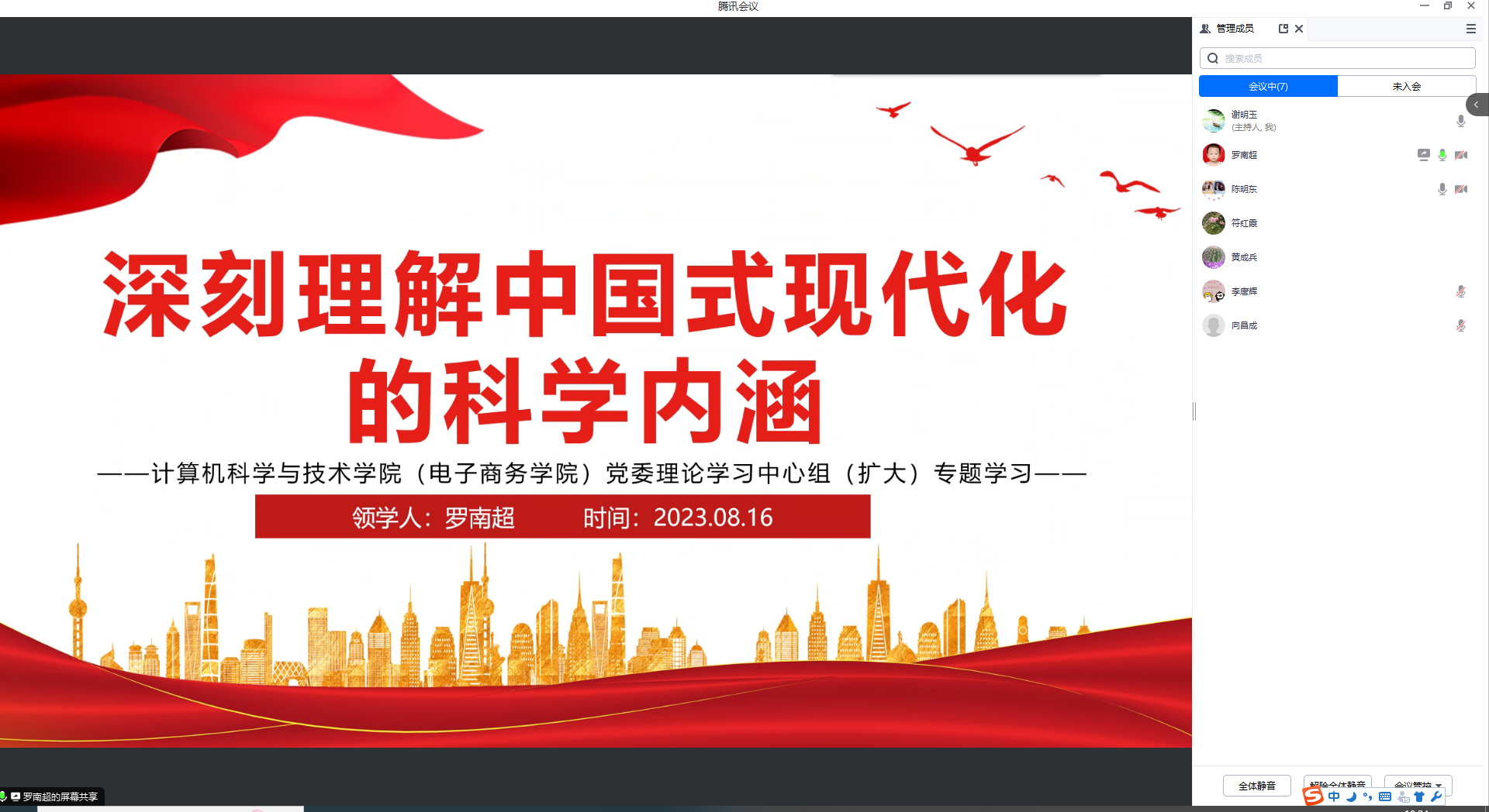 【本网讯】为深入推进学习贯彻习近平新时代中国特色社会主义思想主题教育走深走实,2023年8月16日14:30,我院在线上召开党委理论中心组(扩大)学习会议,学习中国式现代化的科学内涵。学院全体党委委员、院长向昌成、教科办主任李唐辉参加会议,会议由学院党委副书记(主持工作)罗南超主持。