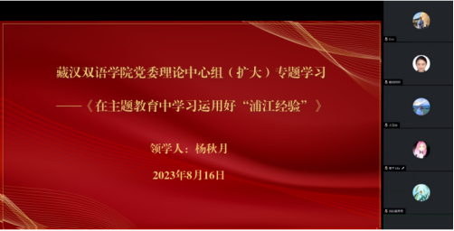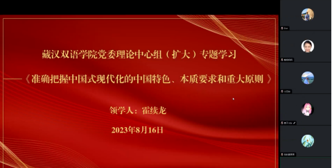 【双语讯】2023年8月16日,藏汉双语学院党委中心组(扩大)在腾讯会议持续开展学习贯彻习近平新时代中国特色社会主义思想主题教育专题学习。此次学习内容主要包括:《准确把握中国式现代化的中国特色、本质要求和重大原则》《浙江“浦江经验”》等内容,由学院党委副书记霍续龙主持。