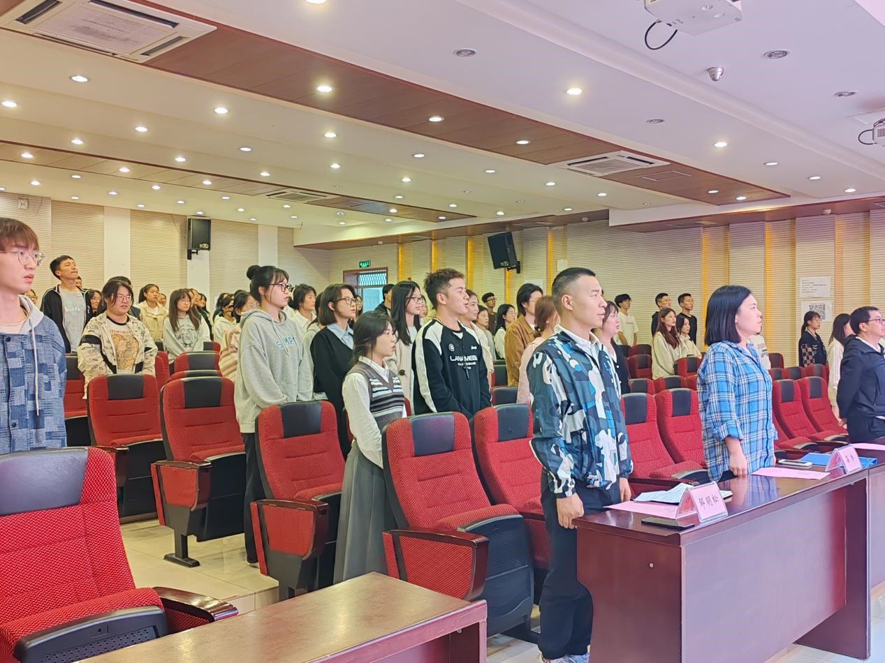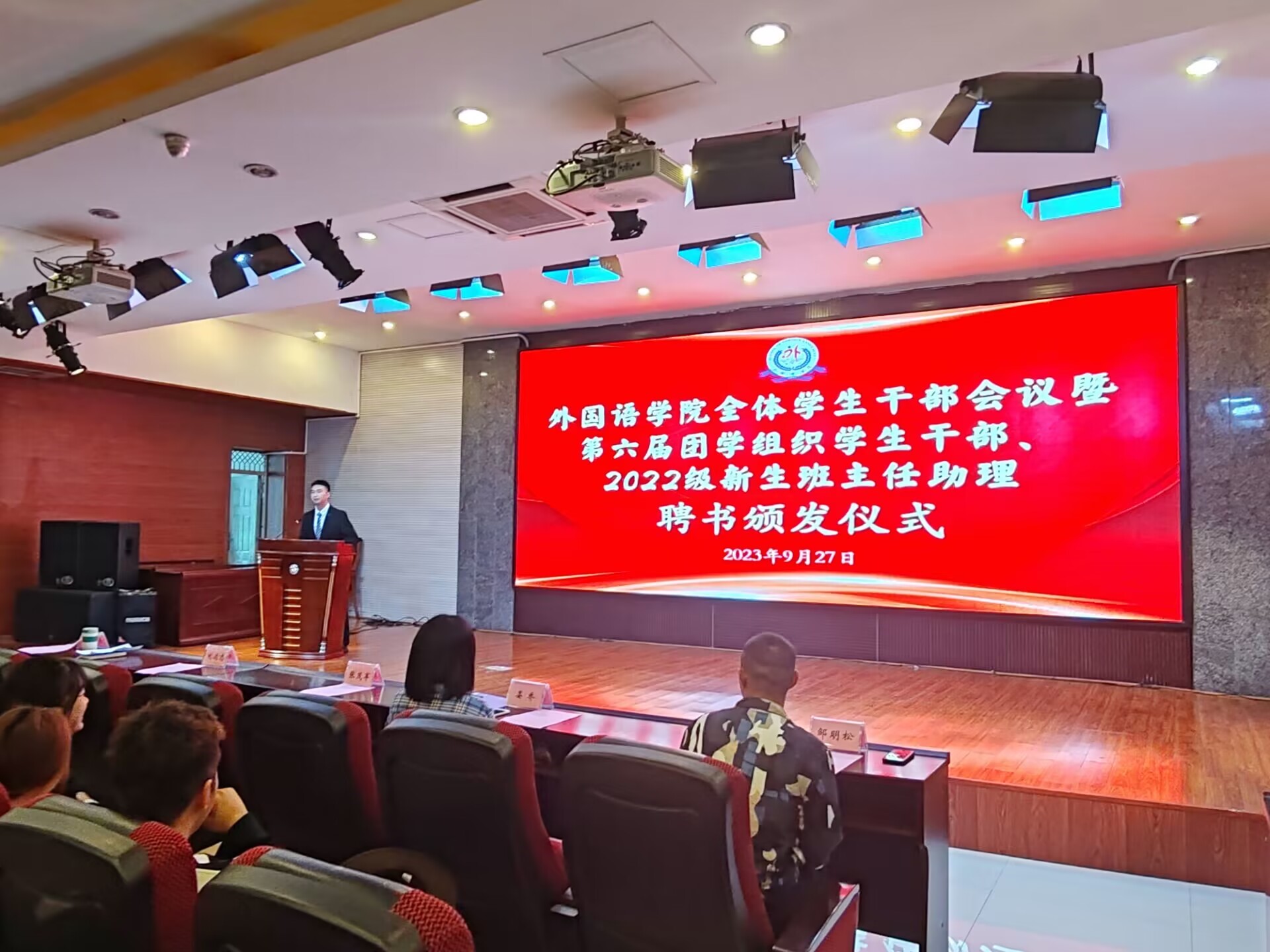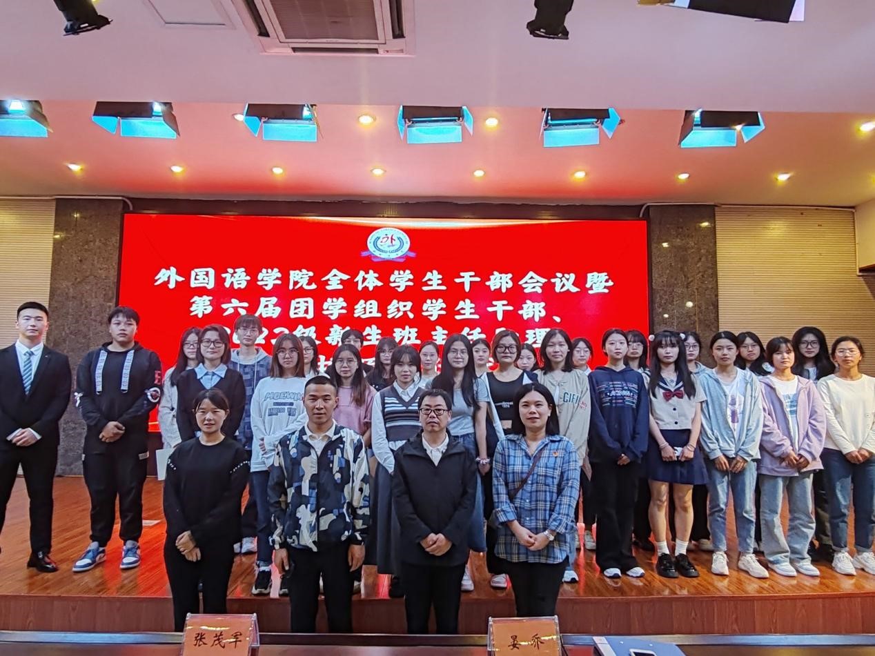【本网讯】 外国语学院于2023年9月27日14:15在图书馆学术报告厅举行全体学生干部会议暨第六届团学组织学生干部、2022级新生班主任助理聘书颁发仪式。出席本次会议的有外国语学院党委书记张茂军、外国语学院院长刘远志、学工办主任兼分团委书记晏乔、团委副书记邹明松、辅导员李柳老师,以及外国语学院全体学生干部。本次会议由唐蔚东主持。