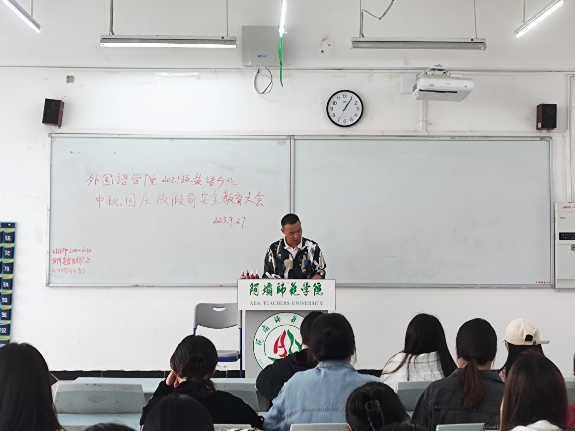【本网讯】 在中秋、国庆长假来临之际,为进一步加强学生安全教育管理工作,增强学生的安全防范意识,全面普及安全常识,让大家度过一个愉快且充实的假期,外国语学院于2023年9月27日分别在树人楼C103、A403开展安全教育主题班会。参会人员有辅导员邹明松、李柳老师、2023级2班班导师夏祖贵,以及2021级、2022级全体学生和2023级2班全体学生。