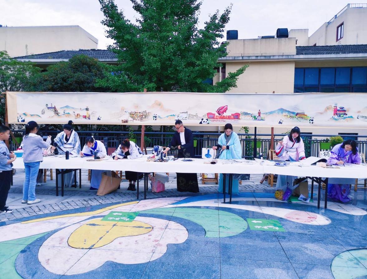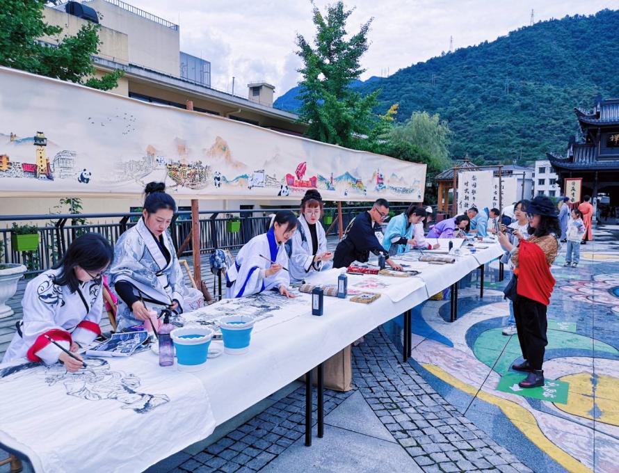 本网讯:2023年9月29日,正是国庆节与中秋节双节假期,在美术学院美术学课程思政专业建设项目负责人黄洋院长的组织下,美术学中国画课程思政教学团队教师积极参加2023首届汶川水磨山居艺术周。在“见山见乡见桃源”主题艺术周的“诗画有云舍”场景展演书画现场创作,与游客沉浸式互动。