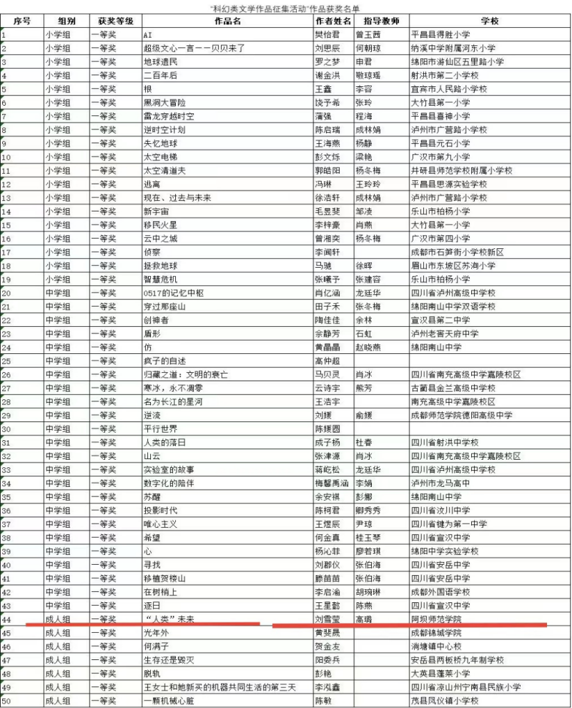 【图2】“科幻类文学作品征集活动” 作品获奖名单