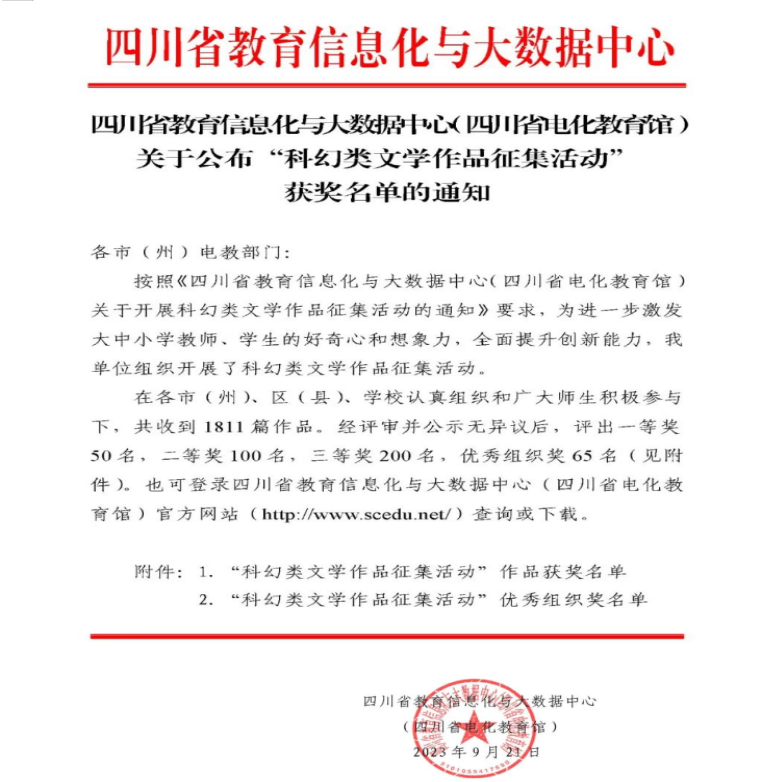 【图1】“科幻类文学作品征集活动” 获奖名单的通知