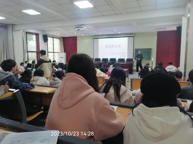 10月23日14:20,伍加旭老师为大家带来 《我是班主任》专题讲座。伍老师用自己的班主任经历让同学们学习到当一个班主任需要具备的特质,提醒大家作为老师要具备很强的责任心,并对班级里的事情做到事无巨细。