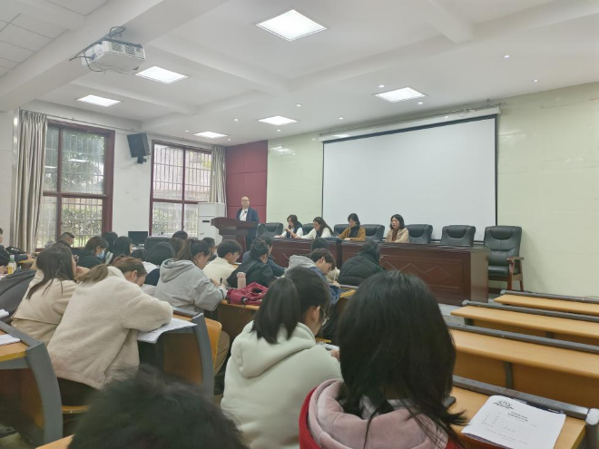 10月25日14:30,罗妮娜老师为同学们带来《如何进行初中英语阅读教学》专题讲座,在讲座中罗老师浅谈了自己对英语阅读教学的心得,最后提醒同学们在阅读课程的设置时应有明确的教学目标和教学计划。