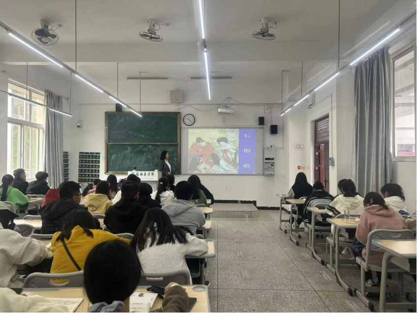 【本网讯】为提高全校公共课程“大学语文”的课堂教学质量,2023年11月3日上午,文学与历史学院郑岁黎大学语文名师工作室、大学语文教研室在树人楼B503教室组织开展了老教师公开示范课教研活动。本次示范课由学院大学语文名师工作室骨干教师张艳副教授主讲,主讲内容为白居易的长篇叙事诗《长恨歌》。大学语文名师工作室成员、大学语文教研室成员和大学语文课程组成员参加了此次教研活动。