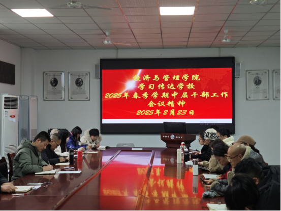 【本网讯】2025年2月23日下午14:00,经济与管理学院在C104会议室召开专题会议,传达学校2025年春季学期中层干部工作会议精神。会议由学院党委书记薛国喜同志主持,院长李清茂教授传达,学院邀请学校党委、副校长刘伟同志参加,学院全体教职工参会。