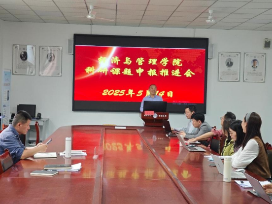 【本网讯】5月14日下午17:00,经济与管理学院在实验楼C104办公室召开2025年春季学期科研课题申报推进会。会议由学院院长李清茂教授主持,党委书记薛国喜同志、学科办公室副主任郭婧、科学工作能力实训教研室主任余涛讲师及全体教师出席会议。会议聚焦科研课题申报,重点解读两大研究中心项目指南,旨在提升学院科研服务地方经济社会发展的能力。