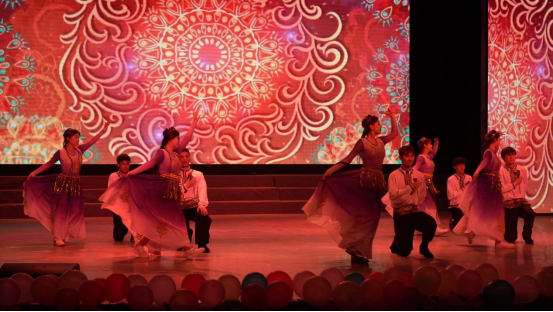 舞台上,维吾尔族学生身着鲜艳艾德莱斯绸,踏着欢快的鼓点旋转跳跃;彝族学生穿着精美的百褶裙,随着步伐摇曳生姿;藏族学生头戴精致头饰,身着藏袍,用优美的舞步诉说着对美好生活的向往。歌曲串烧中,各民族特色唱腔交相辉映,唱出了对祖国的热爱与共筑中国梦的坚定信念。各民族学生如同紧密相依的石榴籽,在舞台上绽放光彩,瞬间点燃了全场气氛,也寓意着各民族在中华民族大家庭中团结一心、共同奋斗。