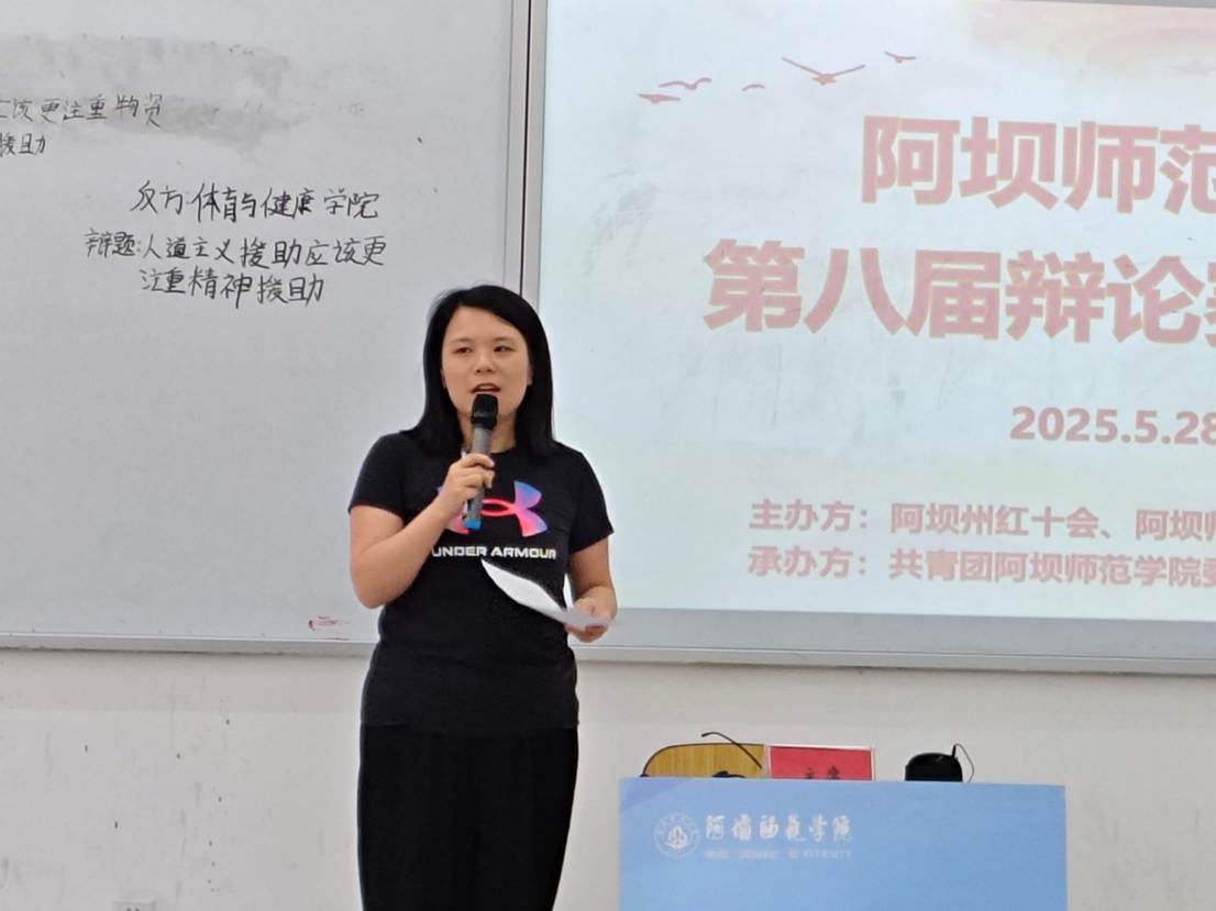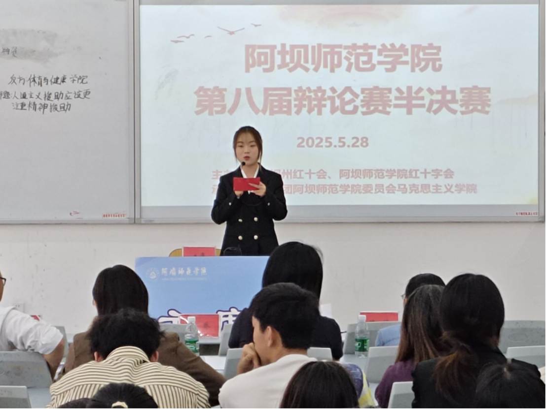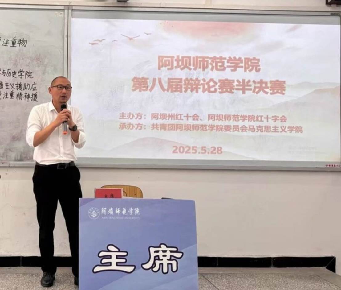 【本网讯】为深入践行红十字精神,促进同学们对人道主义援助的深入了解,增强其思辨能力和表达能力。2025年5月28日14时30分,在树人楼C303、C301分别开展了由阿坝州红十字会、阿坝师范学院红十字会主办,共青团阿坝师范学院马克思主义学院委员会承办的第八届辩论赛半决赛。担任本次辩论赛半决赛的评委有大学生心理健康教育与咨询中心主任欧阳逸、外国语学院学工办主任晏乔、教务处陈婷老师。