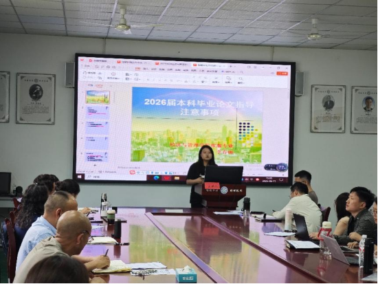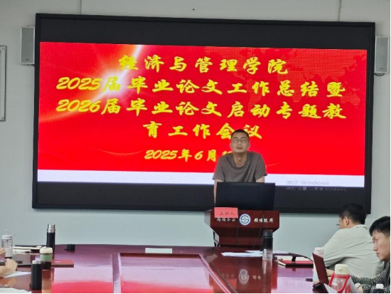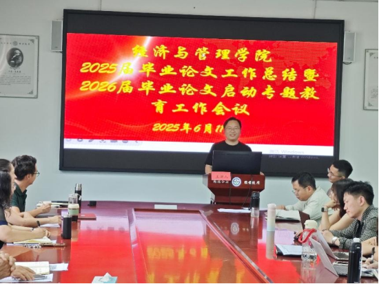 【本网讯】2025年6月11日下午15:00,经济与管理学院在实验楼C104会议室召开2025届毕业论文工作总结暨2026届毕业论文启动工作专题教研会议。会议由学院院长李清茂教授主持,党委书记薛国喜同志、副院长赖静、学科办公室副主任郭婧、财务会计教研室主任谢抒宏讲师、旅游管理与服务教研室主任李春雨讲师、科学工作能力实训教研室主任余涛讲师及教研室全体教师参会。会议围绕“总结经验、规范流程、提升质量”主题,系统梳理2025届毕业论文工作成效,全面启动2026届毕业论文选题与指导工作,为学院人才培养质量提升夯实基础。