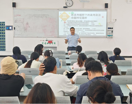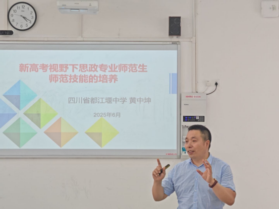 【本网讯】为帮助思政专业师范生更好地适应新高考改革要求,提升师范技能,2025年6月11日马克思主义学院邀请都江堰中学政治教研组长黄中坤老师于树人楼C301开展了“新高考视野下思政专业师范生师范技能的培养”教育教学讲座。此次教育教学讲座内容丰富、针对性强,吸引了我院众多师生到场学习,现场反响热烈。