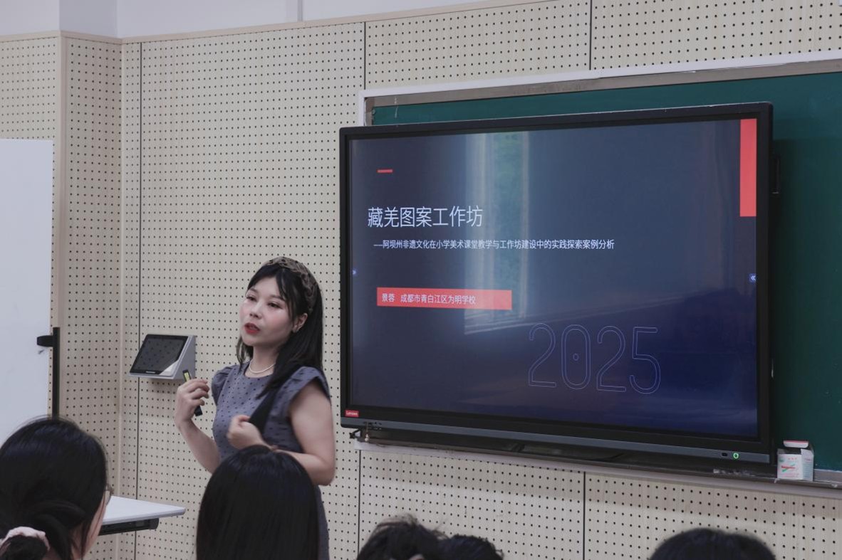 在《阿坝州非遗文化融入中小学美术学科教学的实践探索》项目研究中,她带来《阿坝州非遗文化在小学美术课堂教学与工作坊建设中的实践探索案例分析》讲座。讲座中,景蓉结合阿坝州在地文化视角,通过鲜活的课堂实例与工作坊建设成果,生动阐释了将璀璨的非遗文化基因有效融入基础教育美术课堂的创新模式与实践智慧,为非遗文化的校园活态传承贡献了极具参考价值的“为明方案”。