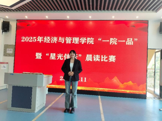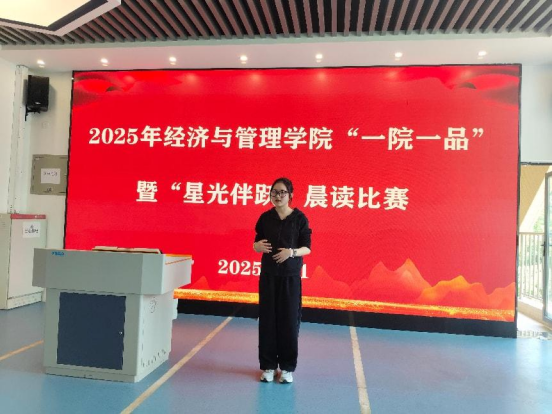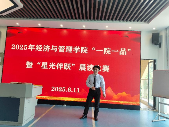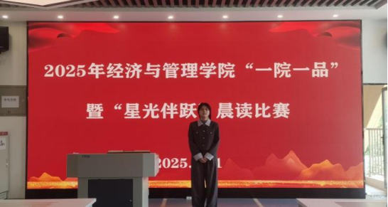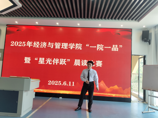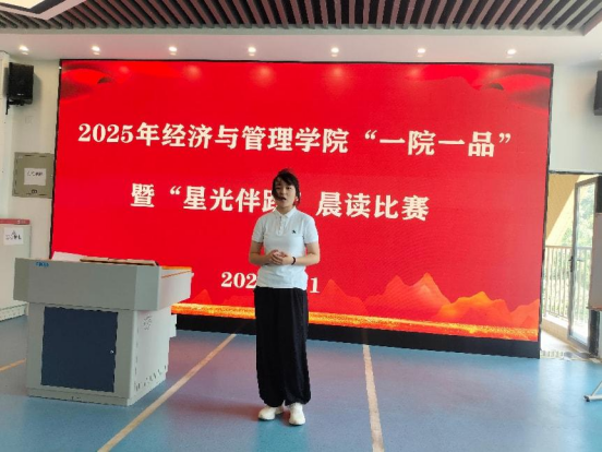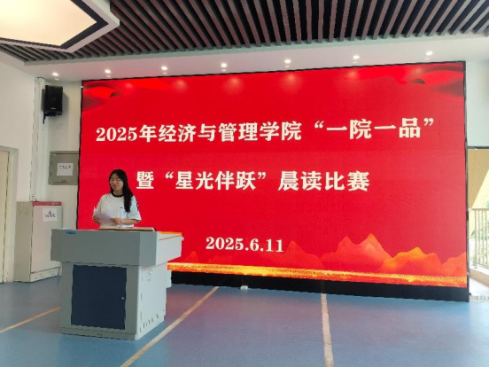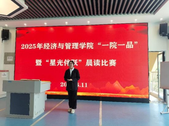 【本网讯】为提升学生语言表达能力与专业知识应用水平,培养良好学习习惯与职业素养,经济与管理学院于2025年6月11日在实验楼C501和C509隆重举办“一院一品”暨“星光伴跃”晨读比赛。比赛分为上、下半场,分别于2025年6月11日12:40和16:10举行,共27位参赛选手依次展示。经济与管理学院院长李清茂、经济与管理学院副院长赖静、财务会计教研室主任谢抒宏、科学工作能力实训教研室主任余涛、辅导员张小威、班导师颜欢担任评委,比赛由张德群主持。