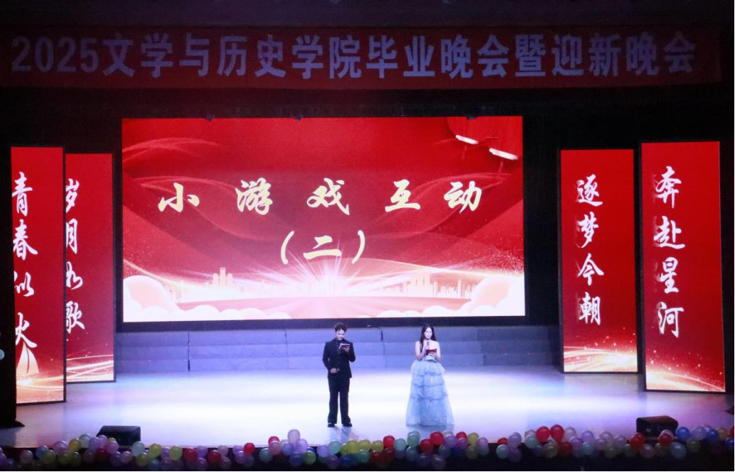 晚会精心设计“千年墨韵,史海拾贝”“青春笔锋,岁月留痕”“未来征途,薪火相传”三大华章,同学们精彩绝伦的节目,在传统与现代的交响中,奏响了文史学子的使命担当。“听歌识曲”“气球大战”的互动小游戏则点燃了现场活力,活跃了现场氛围。