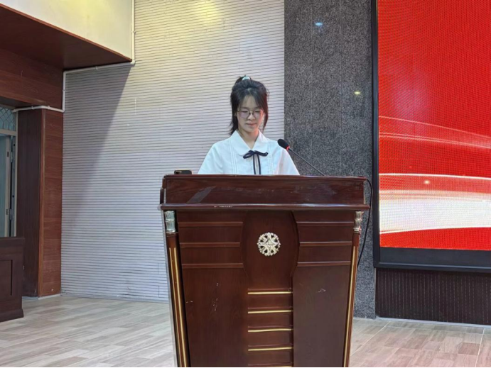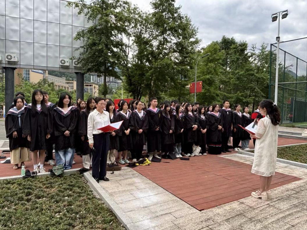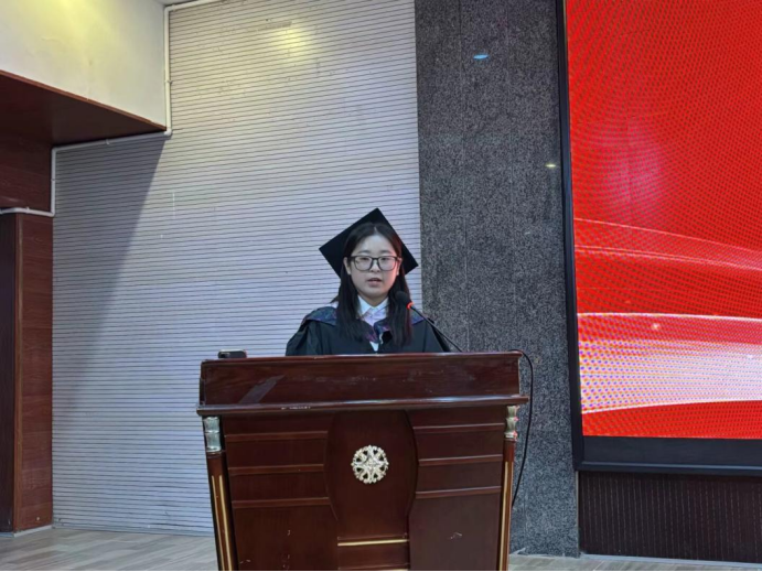 仪式初始,毕业生们身着学士服,准时到达学术报告厅。他们眼神里既有对校园的眷恋,又藏着对未来的期许。首先,由低年级学生代表吴易霖发言,她提到,学长学姐们积极进取的身影,成为了师弟师妹们在学院逐梦的动力坐标。毕业不是终点,而是精神接力的新起点。接着,毕业生代表杨小燕走上讲台。她回顾在校园里经历的点点滴滴,表示2025届毕业生们要带着这些温暖与力量,从学院扬帆,去闯荡更大的天地。
