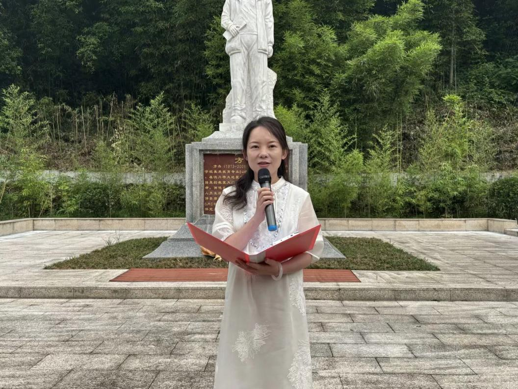接着,在两位副院长的领导下,毕业生们一同走过校园,抵达方杰广场。在这里,方杰的雕像正肃立于此。经过毕业生代表献花与默哀环节后,王曾老师向毕业生们缓缓讲述了方杰老师在汶川特大地震时,为了保护学生安全,用生命撑起希望的故事。王老师讲到,方杰老师用生命诠释了什么是师者仁心,什么是教师育人的担当,她希望2025届毕业生们,无论未来是顺境或逆境,都记得教育者的使命与温度,传承师者精神,让守护与奉献的光芒照亮前行之路。