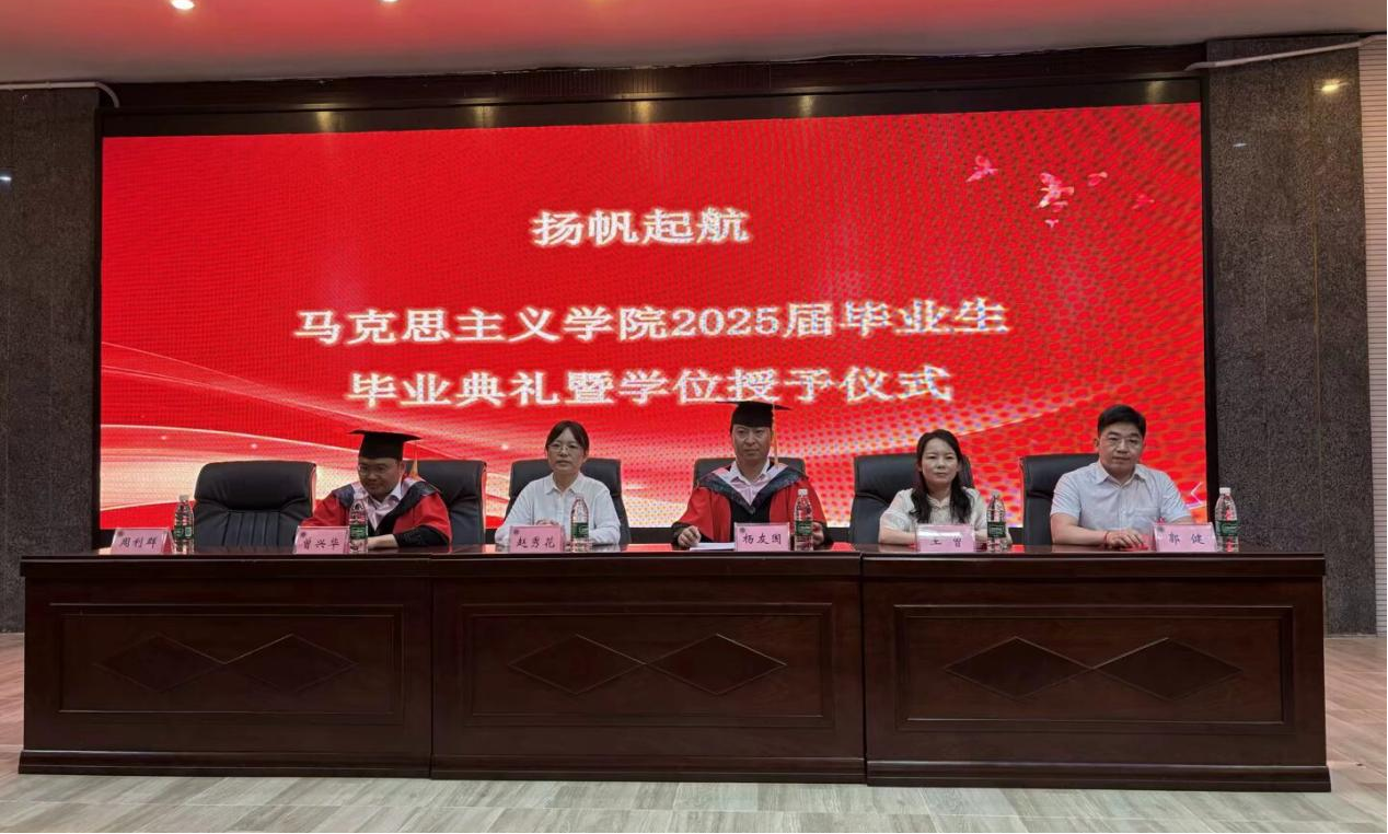 【本网讯】为加深毕业生与学院、师生间的情谊,强化立德树人初心,激励毕业生勇敢迎接未来挑战,2025年6月20日上午8点30分,马克思主义学院举办了2025届毕业生“扬帆启航”毕业典礼暨授位仪式,为毕业生们开启人生新航程。学院党委书记赵秀花,党委副书记、主持工作副院长杨友国,纪委书记、副院长曾兴华,思政教研室主任王曾,学科办副主任郭健,学管办主任周利群以及教师代表江颖与姚媛媛出席,本次毕业典礼由学管办主任周利群主持,依次在学术报告厅、方杰广场和园丁广场三地举行了别开生面的仪式。