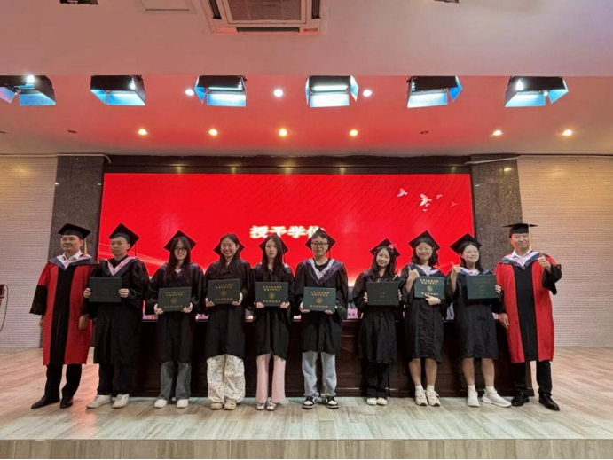 最动人的学位授予环节,副院长杨友国与曾兴华为毕业生们逐一拨穗、颁发证书。当流苏从右至左滑落,象征着学业圆满,更寓意着人生新角色的开启。毕业生们昂首登台,接过的不仅是证书,更是学院沉甸甸的祝福与期许。