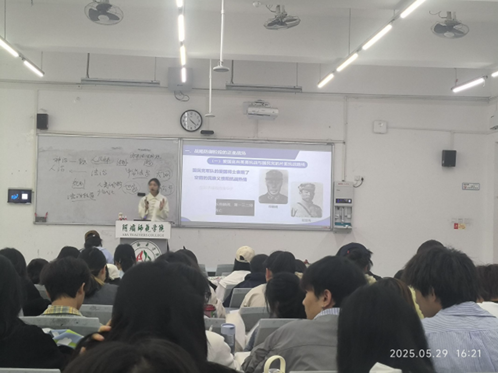 【本网讯】2025年5月29日,马克思主义学院《中国近现代史纲要》课程教研室在树人楼C102教室举行青年教师公开课。此次公开课由马雪老师主讲,教学内容为《中国近现代史纲要》第六章第三节“抗日战争的正面战场”。教研室教研室主任陈世英及其他老师参与此次听课评课活动。