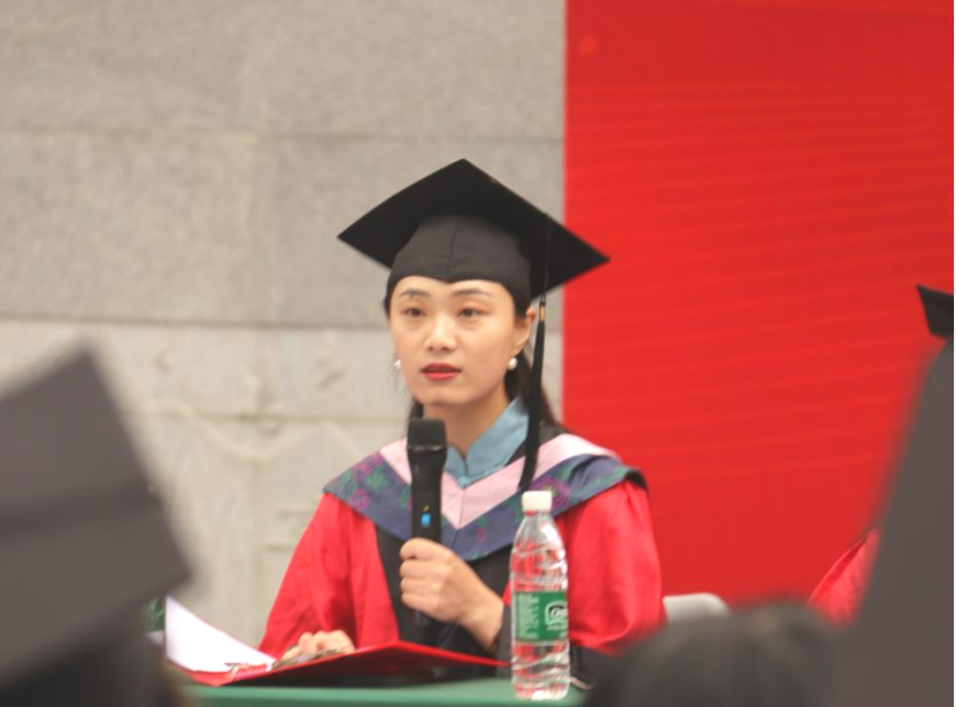 高璐老师代表学院教师发言,为毕业生送上祝福。她以歌词开启祝福,希望同学们无论走到哪里,都能铭记校园时光,保持初心,勇敢追梦。