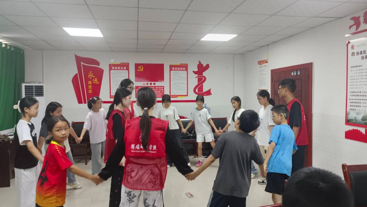 7月15日,活动启动首日,通过班会让实践队各个成员和每个学生进行自我介绍,搭建队员交流桥梁,同时进行趣味小游戏及礼物分发迅速拉近彼此距离,为后续的教学奠定了良好的基础。