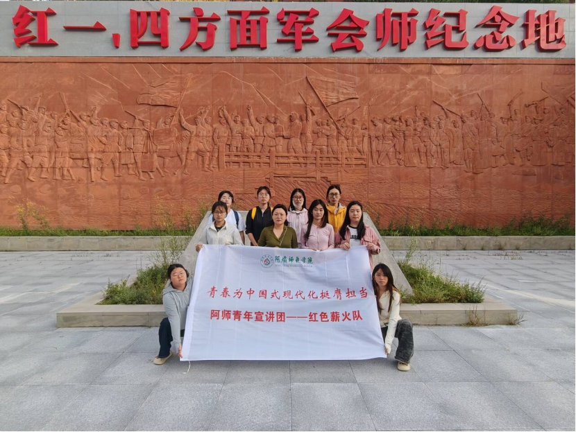 团队随后到达红一、四方面军会师纪念地。大幅红色墙体上,“红一、四方面军会师纪念地”字样庄重醒目,墙体浮雕生动再现了当年红军会师的激昂场景。此前,我们走过会师桥,触摸岁月留下的痕迹;此刻,站在会师纪念地,透过浮雕与文字,重温1935年红一、四方面军胜利会师的历史瞬间,先辈们的热血与信念在这片土地上久久回荡,激励着我们以青春之姿传承红色薪火。