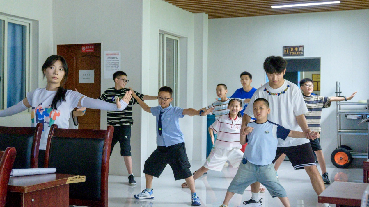 传统文化体验区成为孩子们展现创造力的舞台。在团队志愿者的指导下,42件扎染手帕和30把漆扇作品在孩子们手中诞生。三年级学生王赫举着自己创作的漆扇说:“我要把它送给妈妈。”简单的童言背后,是传统文化在新时代少年心中播下的种子。团队还将传统养生功法八段锦改编为“童趣版”,把“两手托天理三焦”比作“抱西瓜”,“调理脾胃须单举”说成“搬起小桌子”,孩子们在欢声笑语中感受中华文化的智慧。