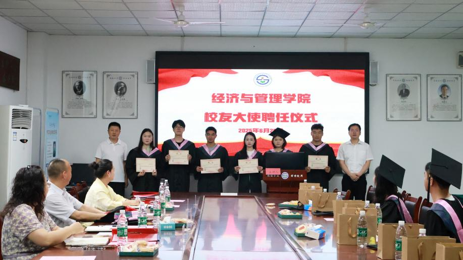 【本网讯】为搭建校友与学院沟通的桥梁,助力人才培养与经验传承,共同强化校友与学院的情感纽带。经济与管理学院于2025年6月20日上午9:00在实验楼C104成功举办了2025届校友大使聘任仪式。经济与管理学院党委书记薛国喜,学院党委副书记、院长李清茂,学院纪委书记、副院长赖静,学院会计教育专业教研室主任谢抒宏,学院学生工作办公室副主任马琳,学院辅导员张小威、次仁次姆,毕业班级班导师李冰野以及2025届毕业生代表出席本次活动。