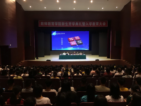 (教院讯)9月12日,全校迎新工作接近尾声,校门口仍然有零零散散的新生报到。下午4:00,我院在南苑剧场隆重举办了新生开学典礼暨入学教育大会。学院党总书记邓志光副教授、院长李强教授、党政办主任叶小军副教授、学工办主任卜凡老师、教学科研办公室主任黎林峰老师、小学教育教研室主任沈明煊副教授、学前教育教研室主任李娟副教授、全体新生班班主任、部分无课教师及2019级全体同学共同出席了本次大会。大会由叶小军老师主持。