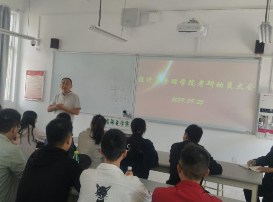 【本网讯】为了加深同学们对考研理解与认识,帮助同学们树立正确人生奋斗目标,增强学生考取研究生的自信心,提升学习竞争力,提高考研成功率,9月25日12:30,经济与管理学院在E401教室召开了2019年考研动员大会。本次动员会不限年级、不限专业,只要是有志考研的同学都可以参加,经管学院党总支副书记薛国喜、副院长李清茂教授、考研负责人张海峰副教授参加了此次动员会,2017级、2018级和2019级有志考研同学参加动员会,会议由张海峰老师主持。