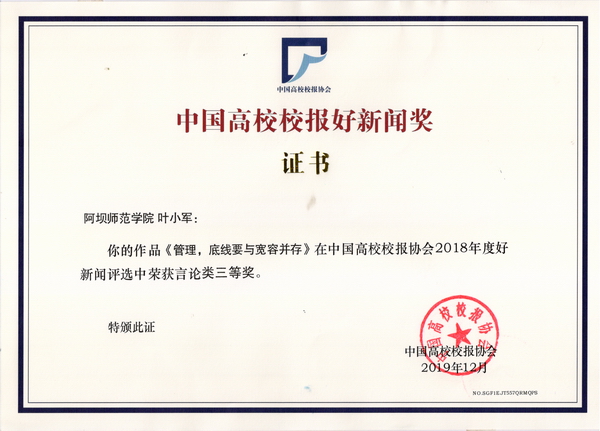 (教院快讯)中国高校校报协会对2018年公开发表的新闻作品组织了数论专家匿名评审,教师教育学院叶小军老师的作品《管理,底线要与宽容并存》成功突围,荣获言论类三等奖。