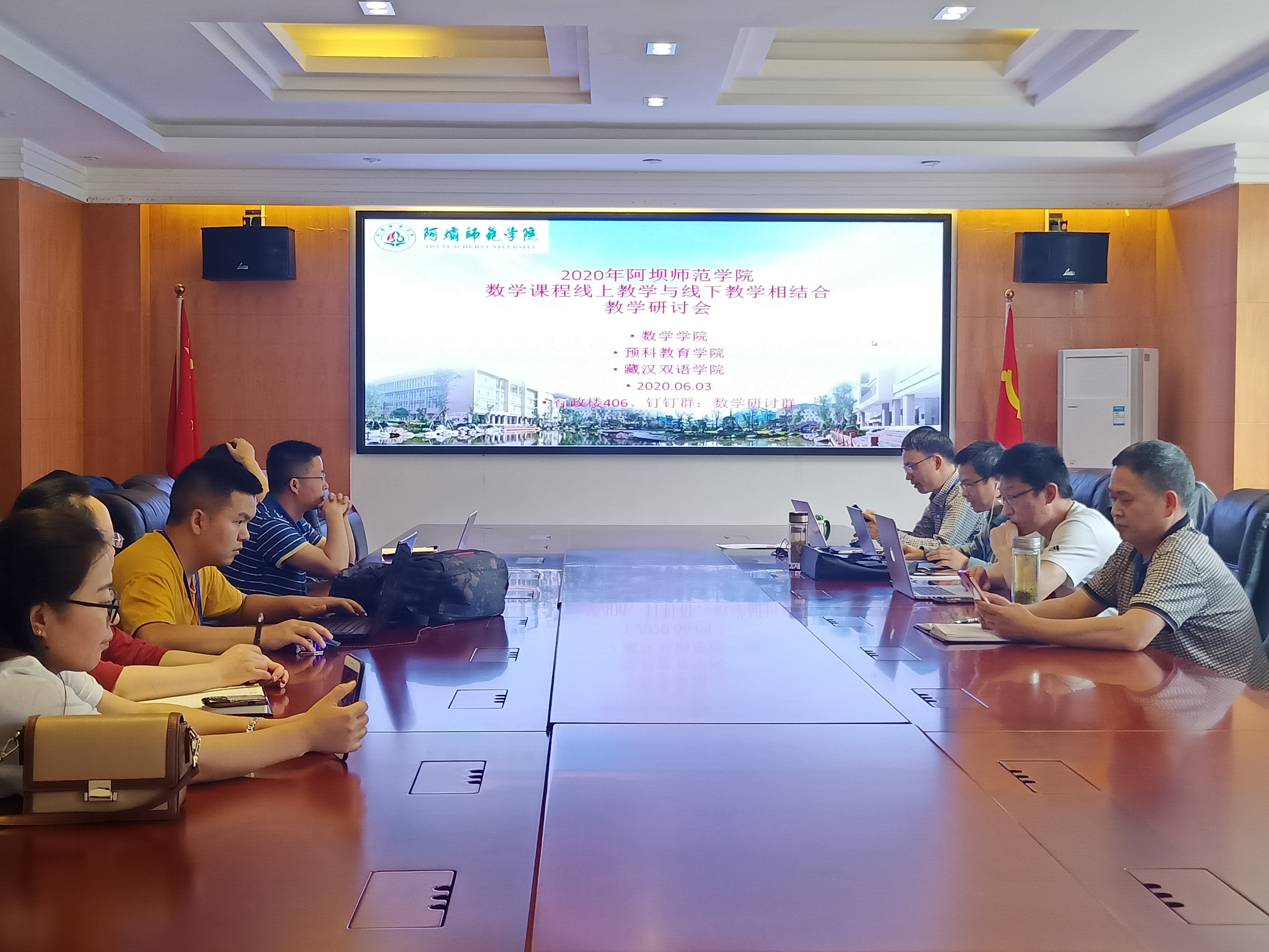 本网讯:为进一步深化教育教学改革,总结教改经验,交流研讨线上教学与线下教学相结合的教育教学方法,展示最新的教学科研成果,促进我校数学课程教师的专业发展,提高教师的教学研究能力,落实立德树人根本任务,6月3日下午,2020年阿坝师范学院“数学课程线上教学与线下教学相结合”教学研讨会顺利举行,会议通过线上钉钉视频会议以及现场会议两种方式进行,数学学院、预科教育学院、藏汉双语学院的数学专业课程教师、学校其它学院的数学课程教师参加了研讨会。