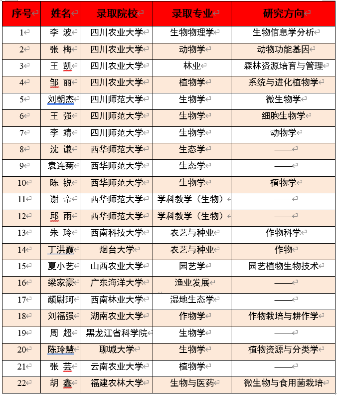 2020年全国硕士研究生招生考试落下帷幕,资源与环境学院2016级生物科学专业57人,共22人考取硕士研究生,专业升学率为38.60%。