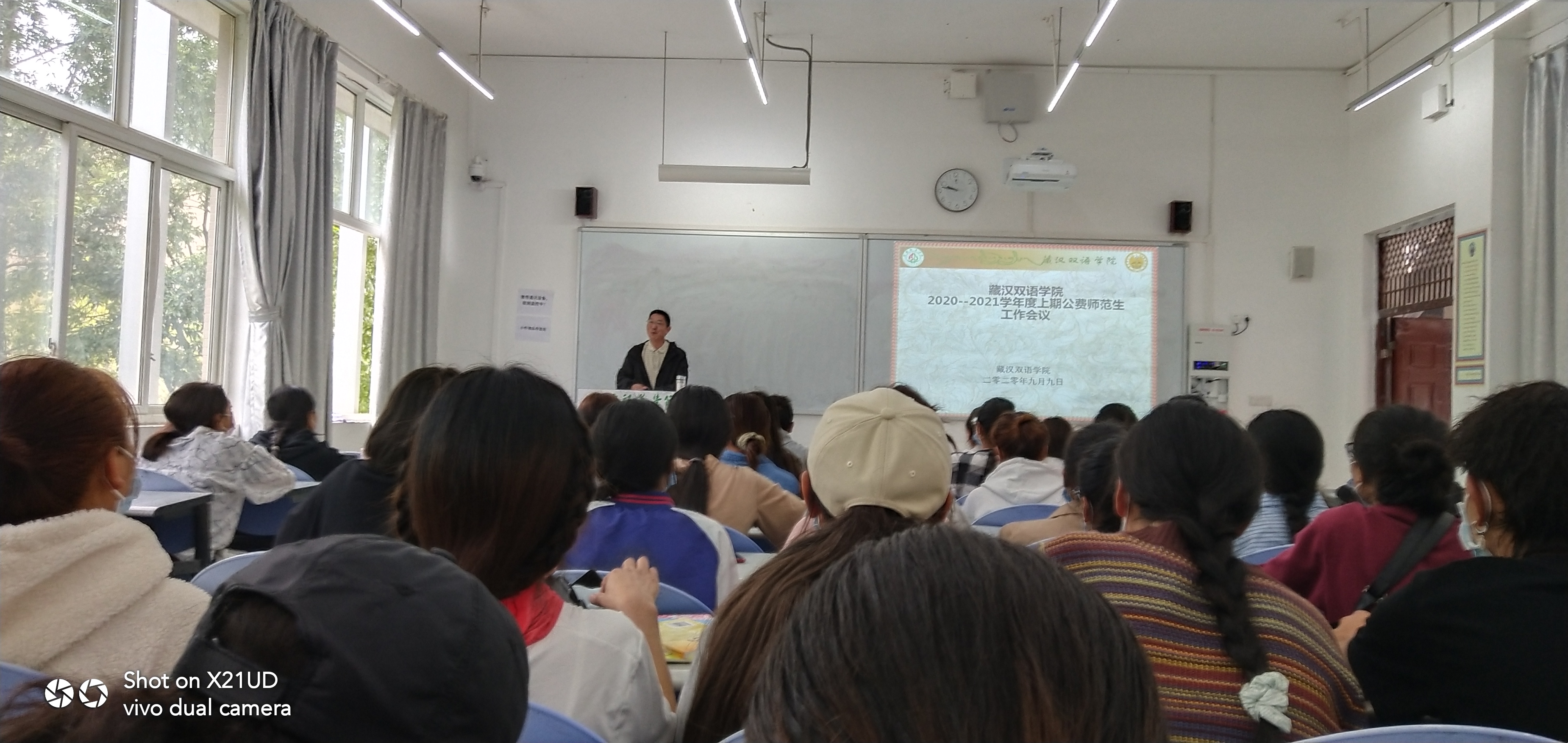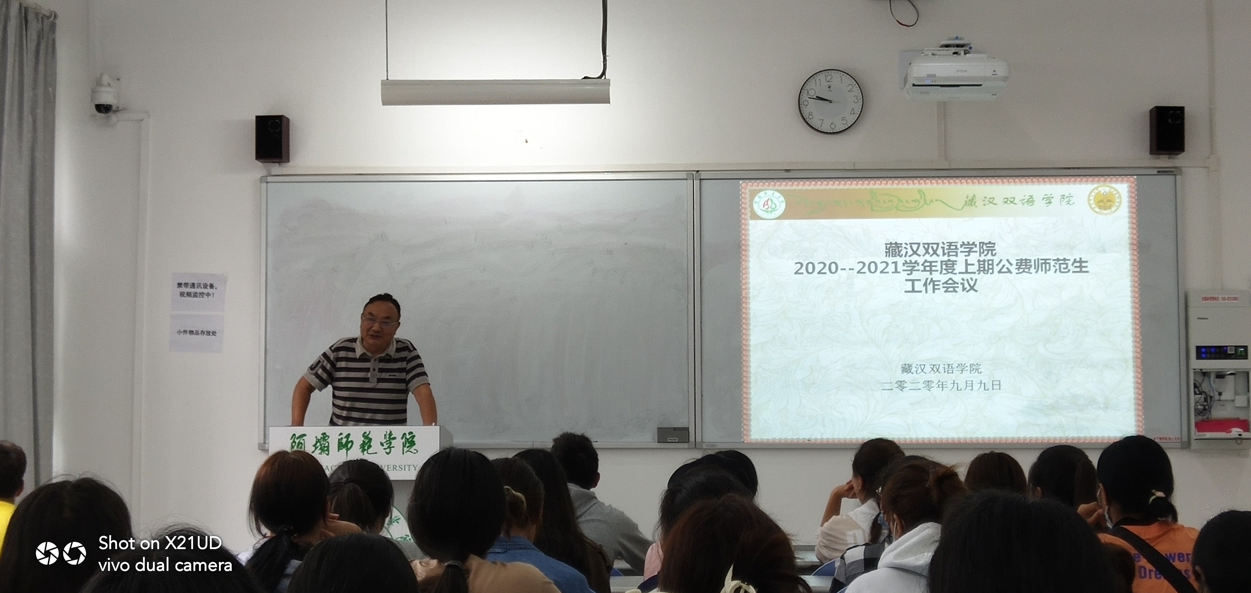 【本网讯】2020年9月9日下午,藏汉双语学院2020--2021学年度上期公费师范生第一次工作会议在树人楼f204召开。藏汉双语学院严木初院长、梁广交副书记及藏汉双语学院所有公费师范生参加,会议由霍续龙老师主持。