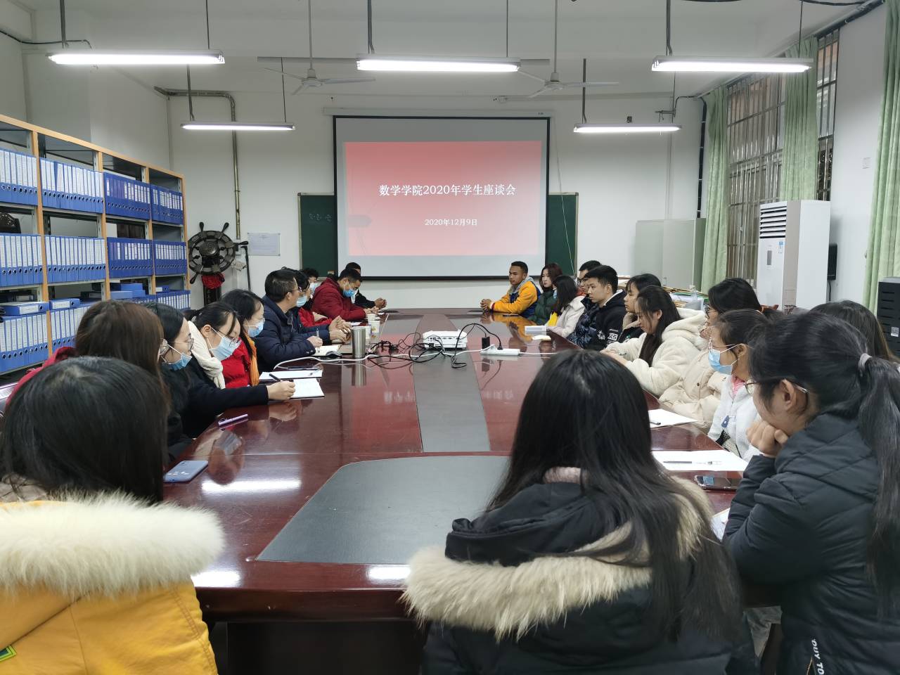 【本网讯】2020年12月9日14:30,以沟通为渠道,搭建师生桥梁。数学学院于实验楼B113举行师生座谈会。出席的有督导处饶延锦老师,许子林老师,学院党总支副书记蒋自国教授,学院副院长杨仕椿教授,教学办公室主任蔡尚媛老师,教研室主任赵伟博士,辅导员金玉洁老师以及18,19级学生代表。