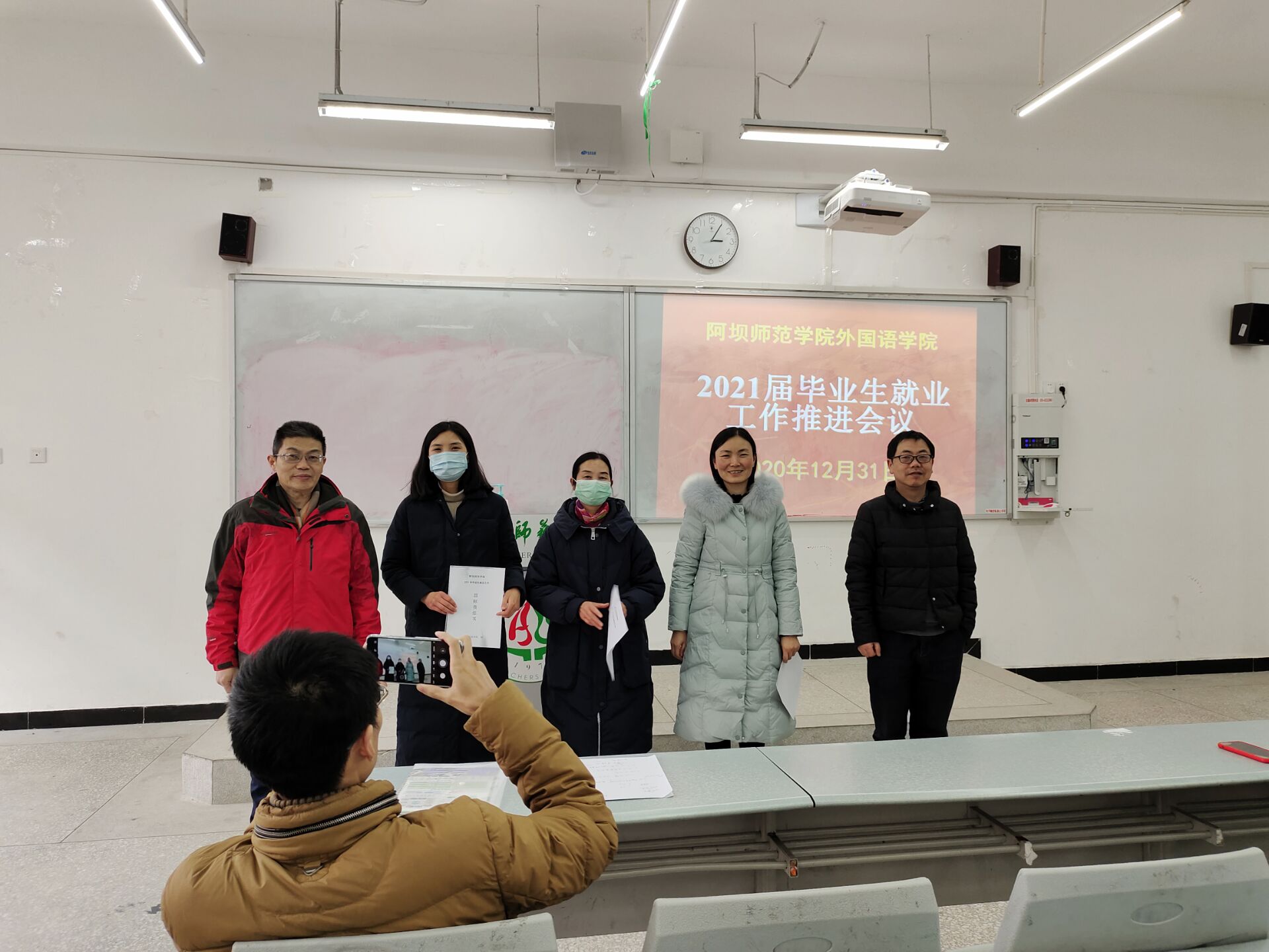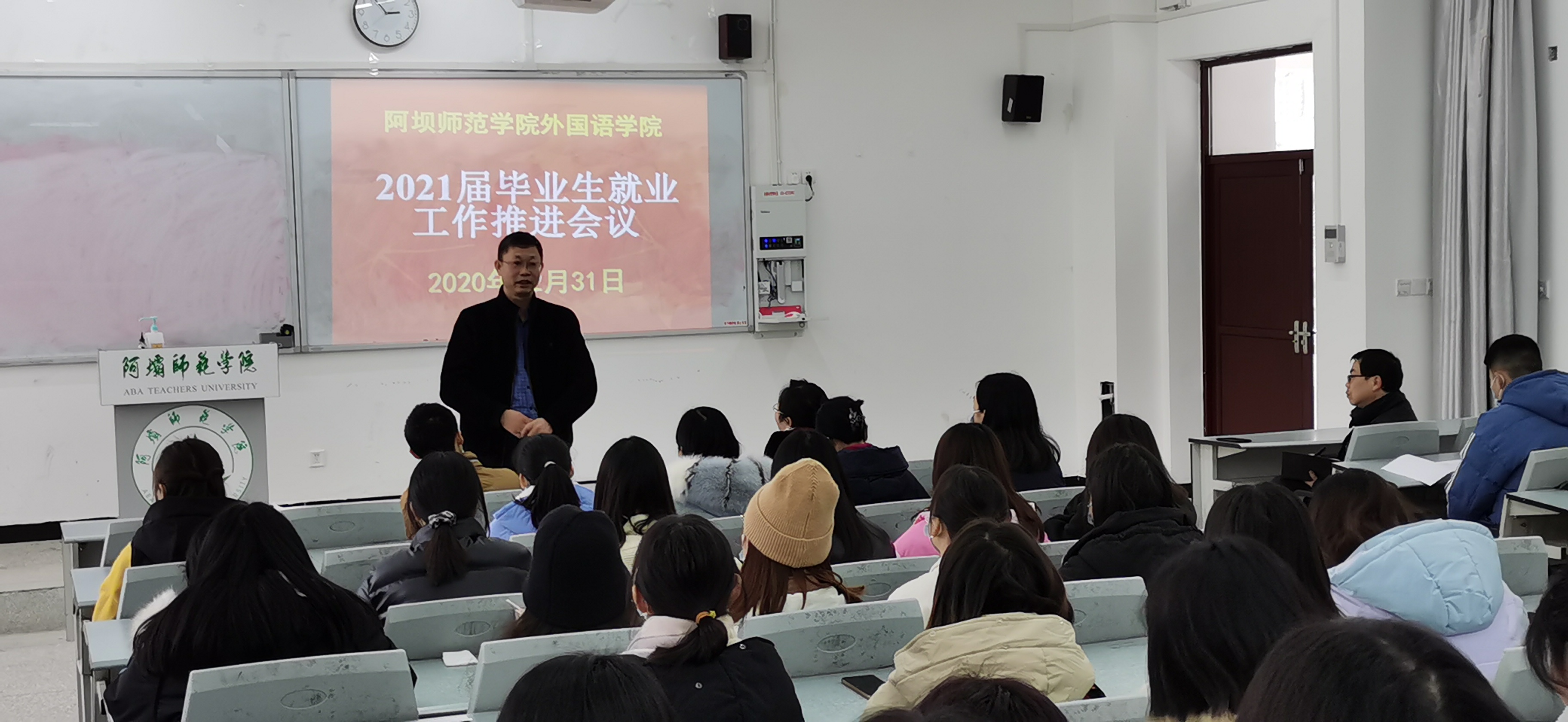 【本网讯】 在极其不平凡的2020年最后一天里,12月31日下午,学校党委副书记、校长向武在工作百忙之中亲临外国语学院2021届毕业生就业工作推进会,为2021届毕业生加油鼓劲,给丝丝寒意的校园带来了阵阵的暖意。外国语学院党总支书记宋明主持了推进会,院长刘远志作了发言,2017级英语本科班班主任、2018级商务日语专科班班主任接受了外国语学院领导授予的就业工作目标任务书,2021届毕业生参加了推进会。