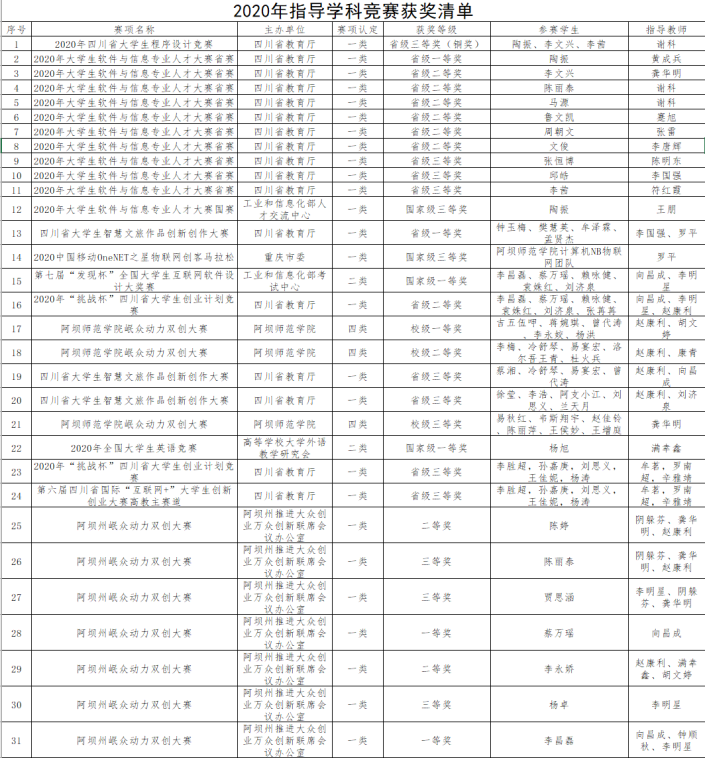 2020年度,在省教育厅主持开展的55个省级大学生竞赛项目中,我院组织学生参加了包括四川省大学生软件和信息技术专业人才大赛、四川省大学生“智慧文旅”作品创新创作大赛及四川省大学生程序设计大赛、“挑战杯”四川省大学生创业计划竞赛和阿坝州岷众动力双创大赛等在内的各级各类多项赛事,取得了国家级一等奖两项、国家级三等奖两项、省级一等奖两项、省级二等奖七项、省级三等奖八项的优异成绩,得到了省教育厅、学校主管领导的表扬和肯定。这也是对我院在深化教育教学改革、探索创新人才培养模式、强化学生创新精神和实践能力、提高人才培养质量方面的工作给予的认可。在此,对获奖的同学和指导老师表示由衷的祝贺和感谢!我院将在今后的学生竞赛工作上再接再厉,为指导老师和参赛同学提供更好的平台,力争取得更好的成绩!